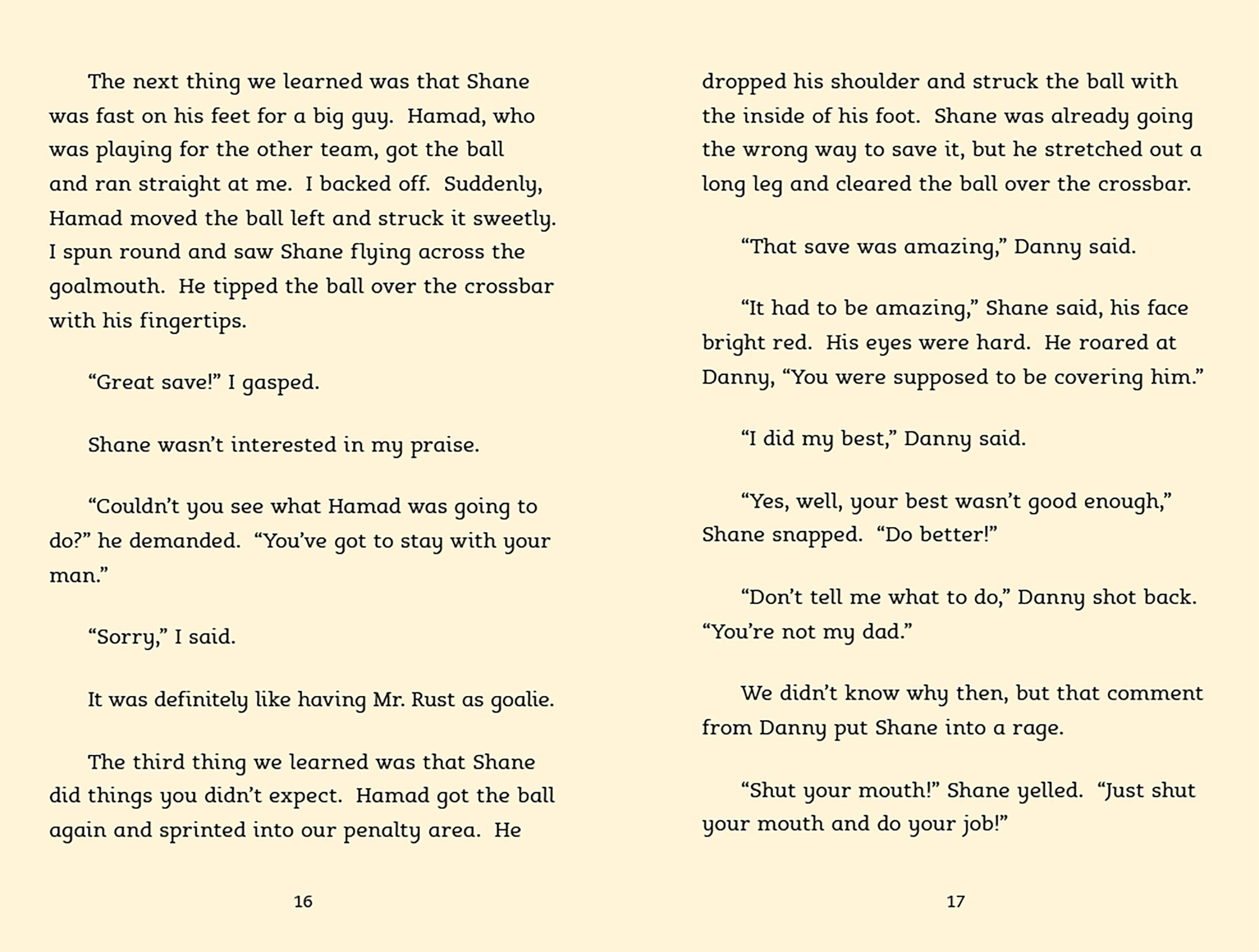The North Star soccer team is thrilled when Shane, the new boy at school, turns out to be a talented goalkeeper. But Shane has a temper that gets him in trouble and a demanding father who acts out on the sidelines at every game. Soon Shane’s teammates start to worry that something is really wrong—and that Shane’s not nearly as tough as he seems.