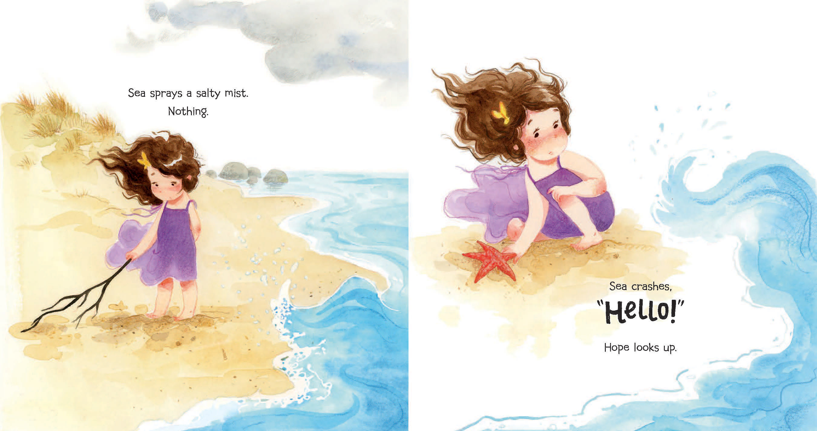 As Hope huddles on the shore, feeling big feelings of sadness, Sea approaches. First a gentle wave, then a misty spray, followed by the toss of a seashell, and a race along the shoreline. With each overture from Sea, Hope’s heart opens just a bit more, until finally a burst of laughter escapes and her loneliness recedes along with the waves. With its gentle and poetic language, this uplifting story looks at the importance of friendship and encourages children to open their hearts to the world around them.