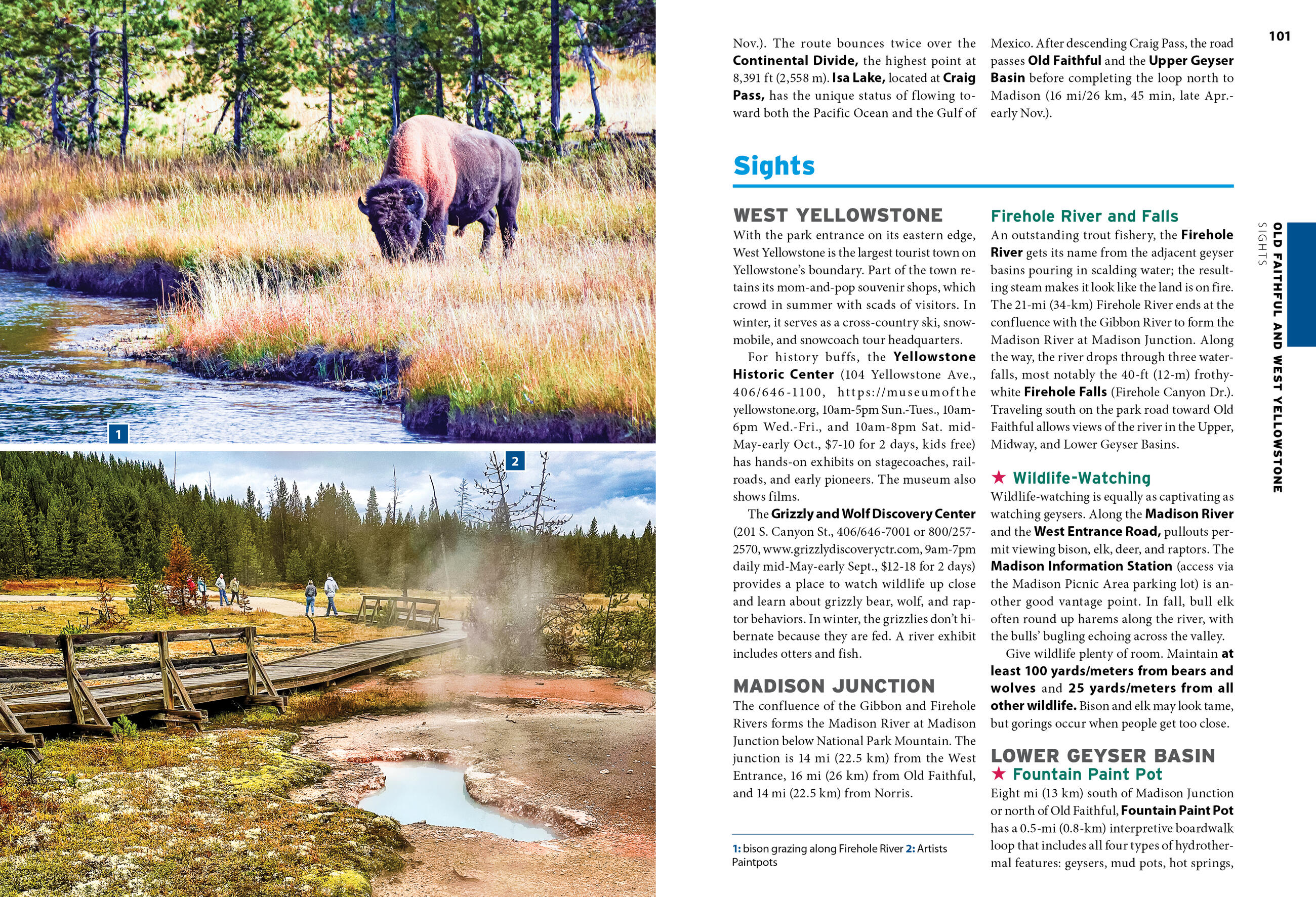 - Experience the outdoors: Marvel at the steam-spewing Old Faithful geyser or take a horseback ride to panoramic lakeside views. Hike through alpine forests to rushing waterfalls and catch a glimpse of wild bison, elk, wolves, or bears. Bask in the colorful radiance of Grand Prismatic Spring or stroll the boardwalks along Mammoth Hot Springs. Climb to Inspiration Point for breathtaking views of Jackson Hole and Jenny Lake, explore the quirky nearby towns, or discover the best spots to hit the slopes during the winter season