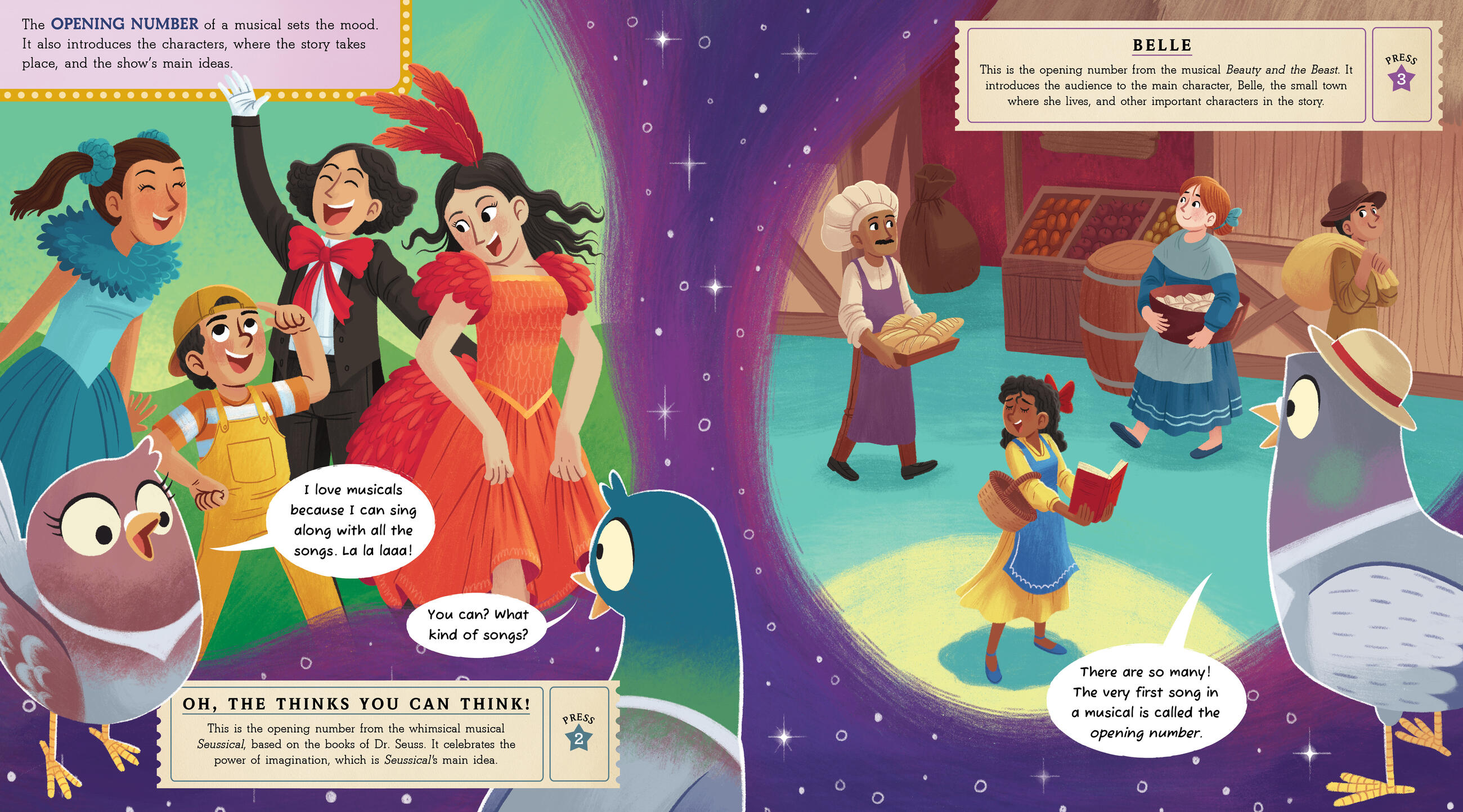 Along the way, you’ll learn about the history of Broadway and all the sensational elements of a Broadway show, from patter songs and ballads to costumes and choreography, with a trio of New York City pigeons as your tour guides. Here’s your ticket. Enjoy the show! (And don’t forget to sing along.)