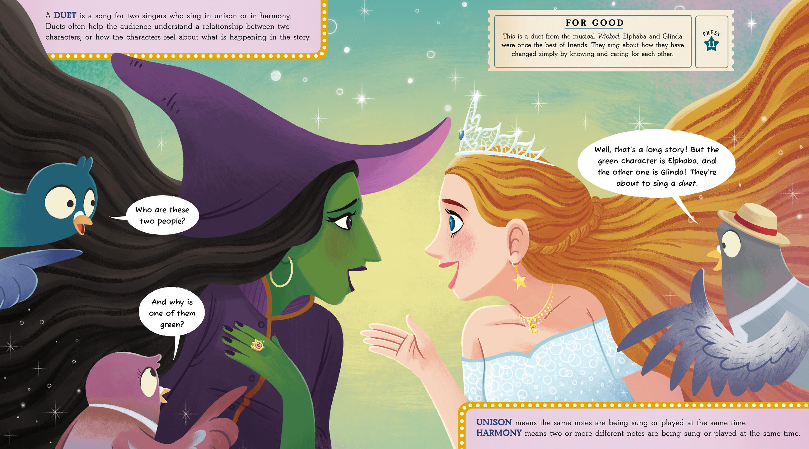 Embark on a dazzling adventure through New York City’s theater district, and the shows it’s famous for, in this illustrated introduction to Broadway musicals, for readers ages 4 and up. As you read, press the 12 interactive sound buttons that play iconic show tunes—including “For Good” from Wicked, “Tomorrow” from Annie, “Belle” from Beauty and the Beast, and so many more. You’ll hear the rhythmic steps of a tap dancer, a singer belting a solo, two infamous witches singing a duet, and a chorus performing a showstopping finale.