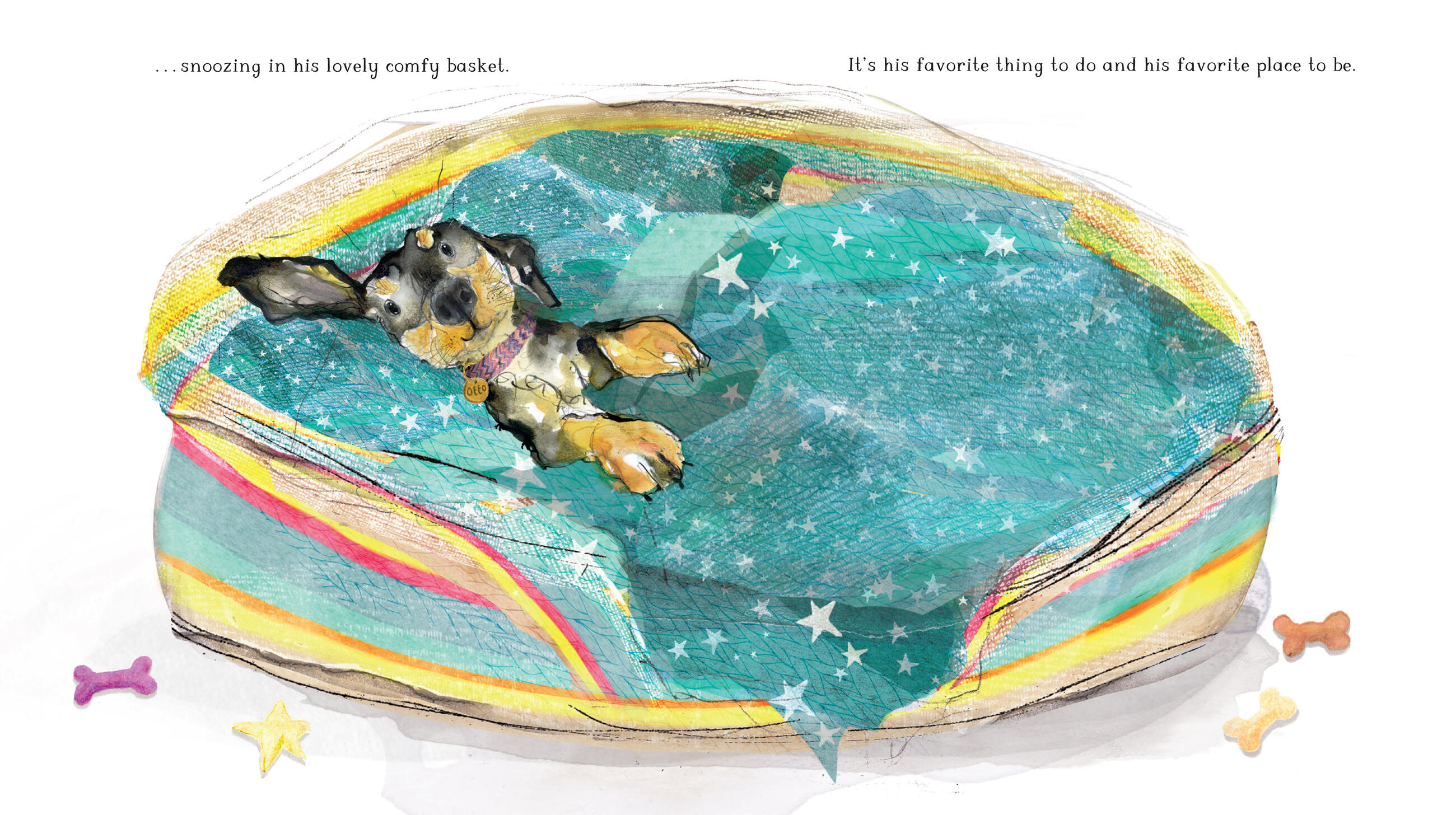 And before he can say ‘walkies’ his other friends all come and stay because Lupin has told them all how comfy Otto’s basket is. Soon they are all nestled in— with a beautiful Boxer dog taking center stage, of course. Even Bently, the Great Dane snuggles down! Otto is none too pleased and a tad grumpy at his lack of sleep. So, he devises a plan. The next day, Otto goes shopping and buys beds to suit all his friends. But when Otto settles back into his own bed, all by himself, he cannot sleep, neither can his friends. The solution is easy, all get back into one big comfy heap and doze! And Otto can sleep on TOP!