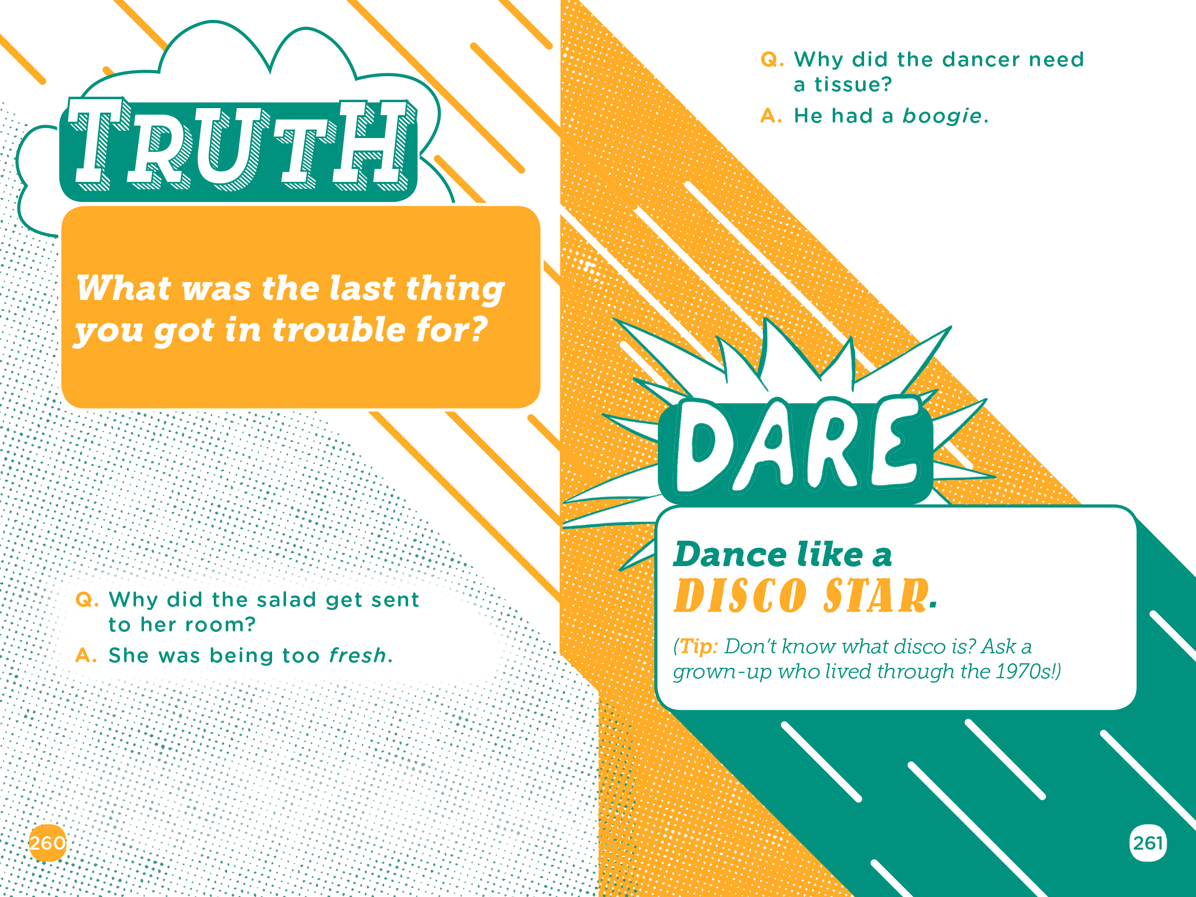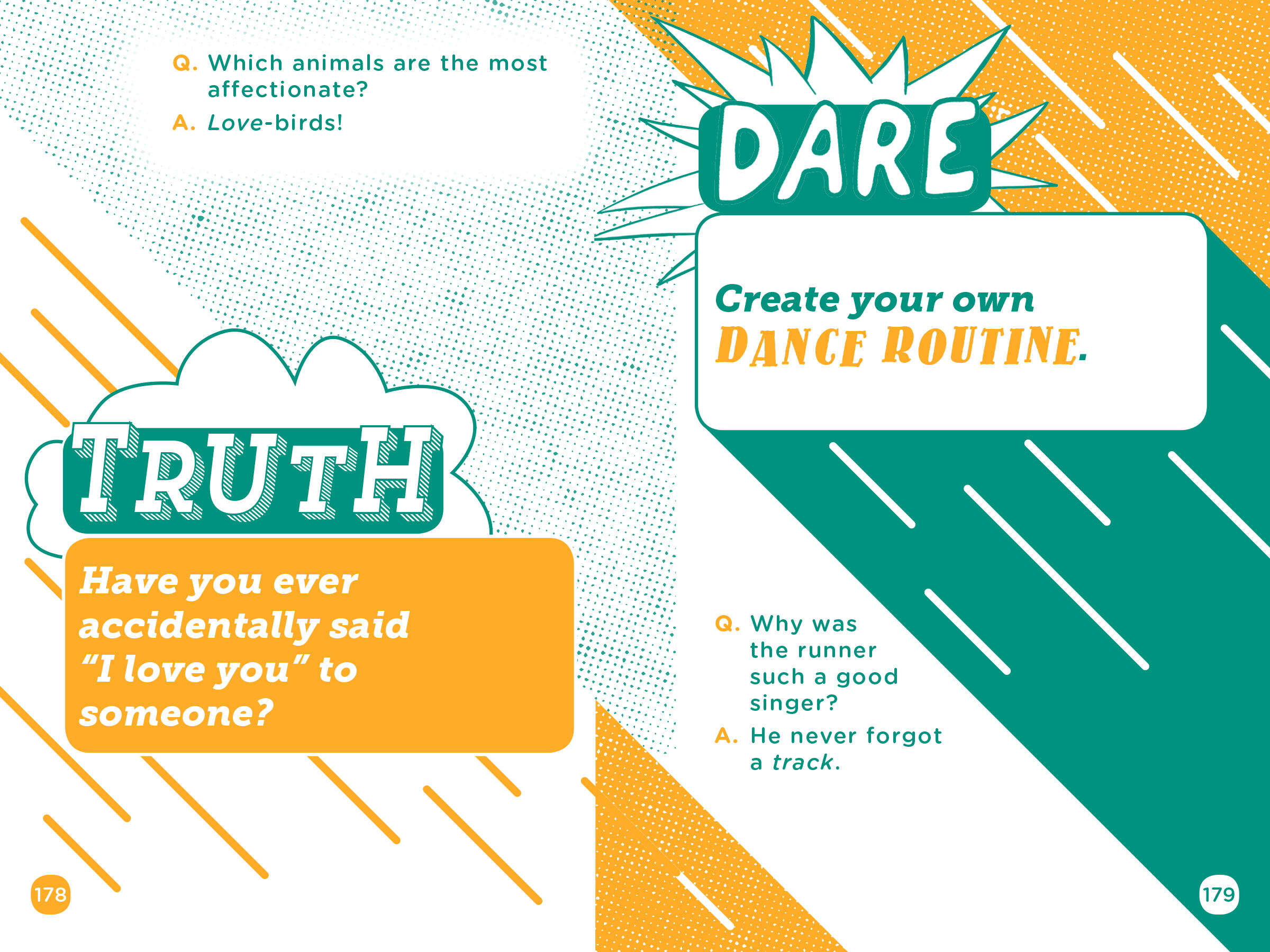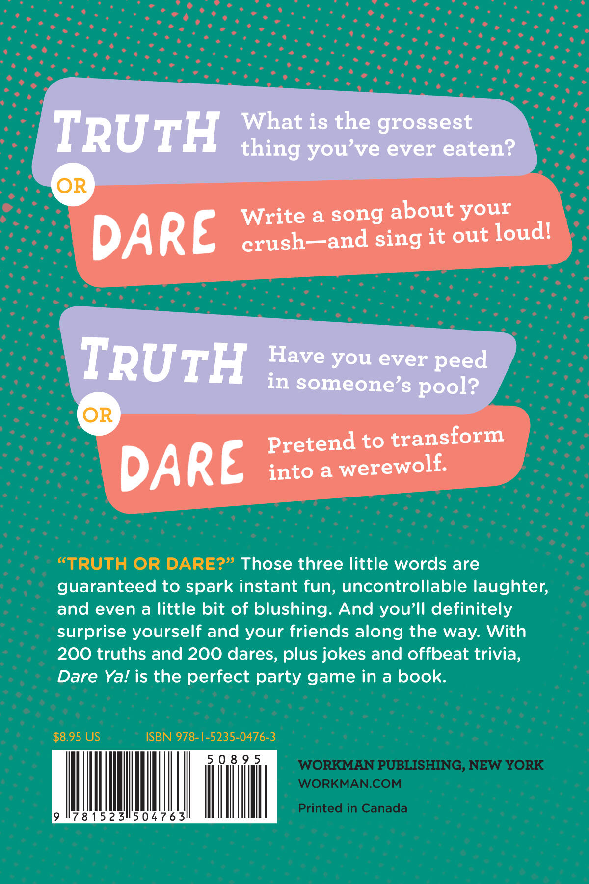 “TRUTH OR DARE?” Those three little words are guaranteed to spark instant fun, uncontrollable laughter, and even a little bit of blushing. And you’ll definitely surprise yourself and your friends along the way. Includes 200 truths and 200 dares, plus jokes and offbeat trivia.