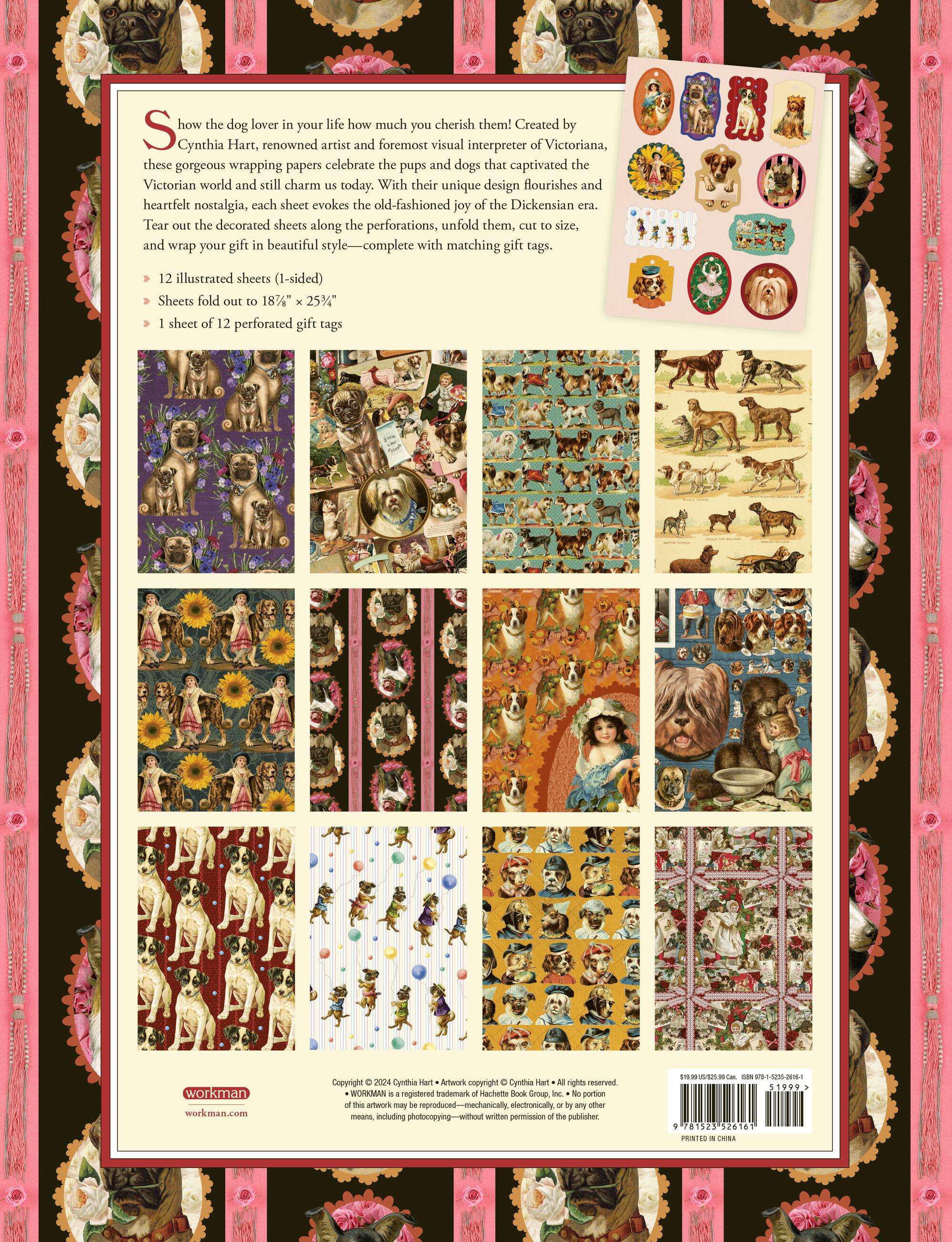 Dogswere celebrated during the Victorian era because they embodied important cultural values of the time: steadfast, loyal, courageous. They became the most popular domestic pets—Dash, a King Charles Spaniel, was considered Queen Victoria’s closest childhood companion—and were pampered just as they are today. Created by artist Cynthia Hart, who layers antique paper ephemera, fresh flowers, ribbons, and vintage objects into lush collages filled with life, color, and energy, these twelve gorgeous sheets of wrapping paper and gift tags will make the wrapping as desirable as the gift inside. Tear out the decorated sheets along the perforations, unfold them, cut to size, and wrap your gift in beautiful style.