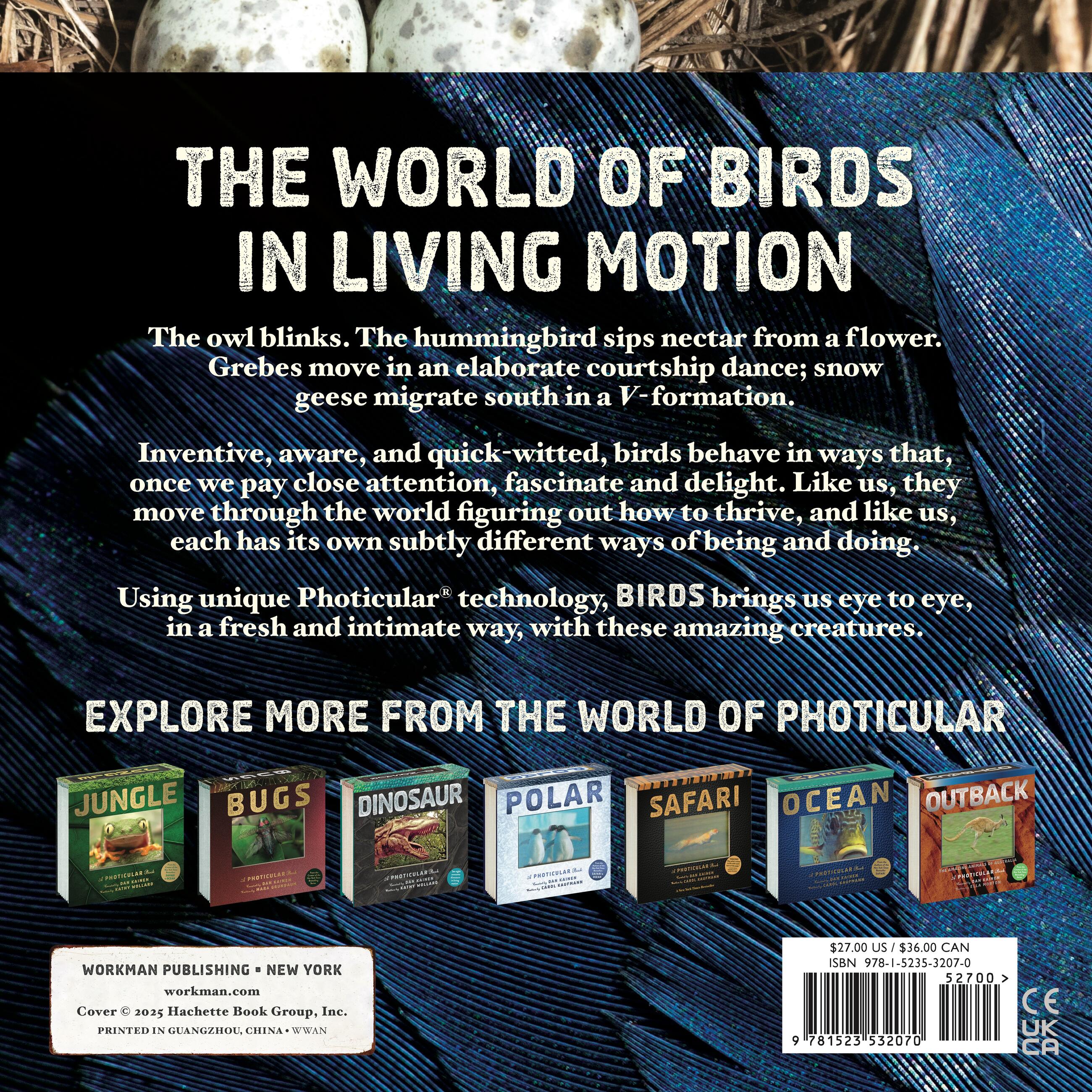 Using Photicular technology—an innovative lenticular-based technology that uses precision sliding lenses and four-color video imagery—each image is like a 3D movie on the page, delivering a rich, fluid, immersive visual experience. Penguins hop, Grebes dance in an elaborate courtship ritual, lovebirds preen, the eyes of an owl blink, geese migrate in V formation, a hummingbird sips nectar from a flower, and a mother songbird feeds its new hatchlings.
