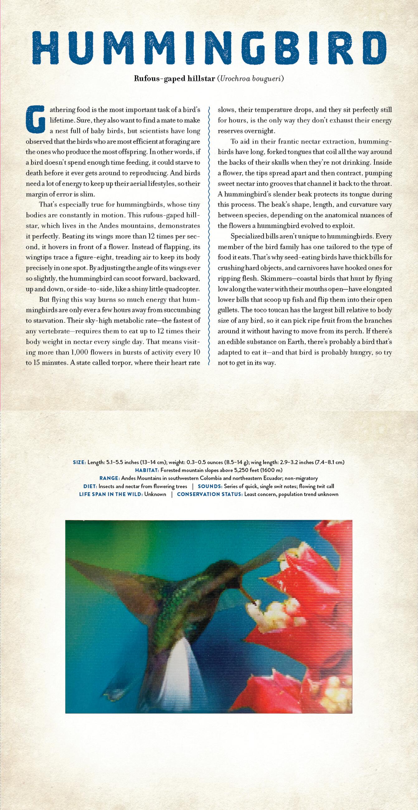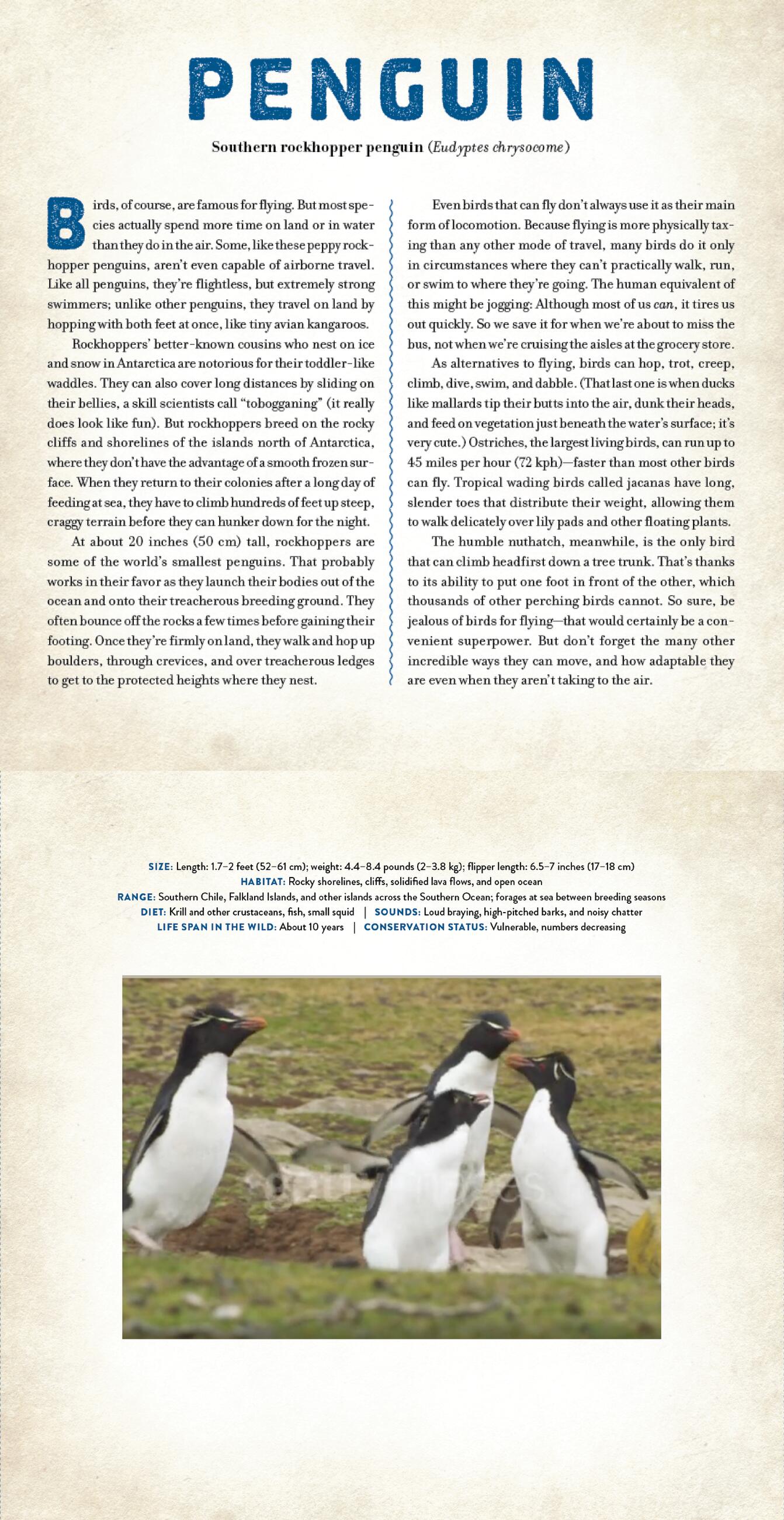 The opening essay focuses on bird behaviors—the weird, and the surprising. The profile accompanying each animal image includes information on each species. It’s an aviary that you can hold in your hands!