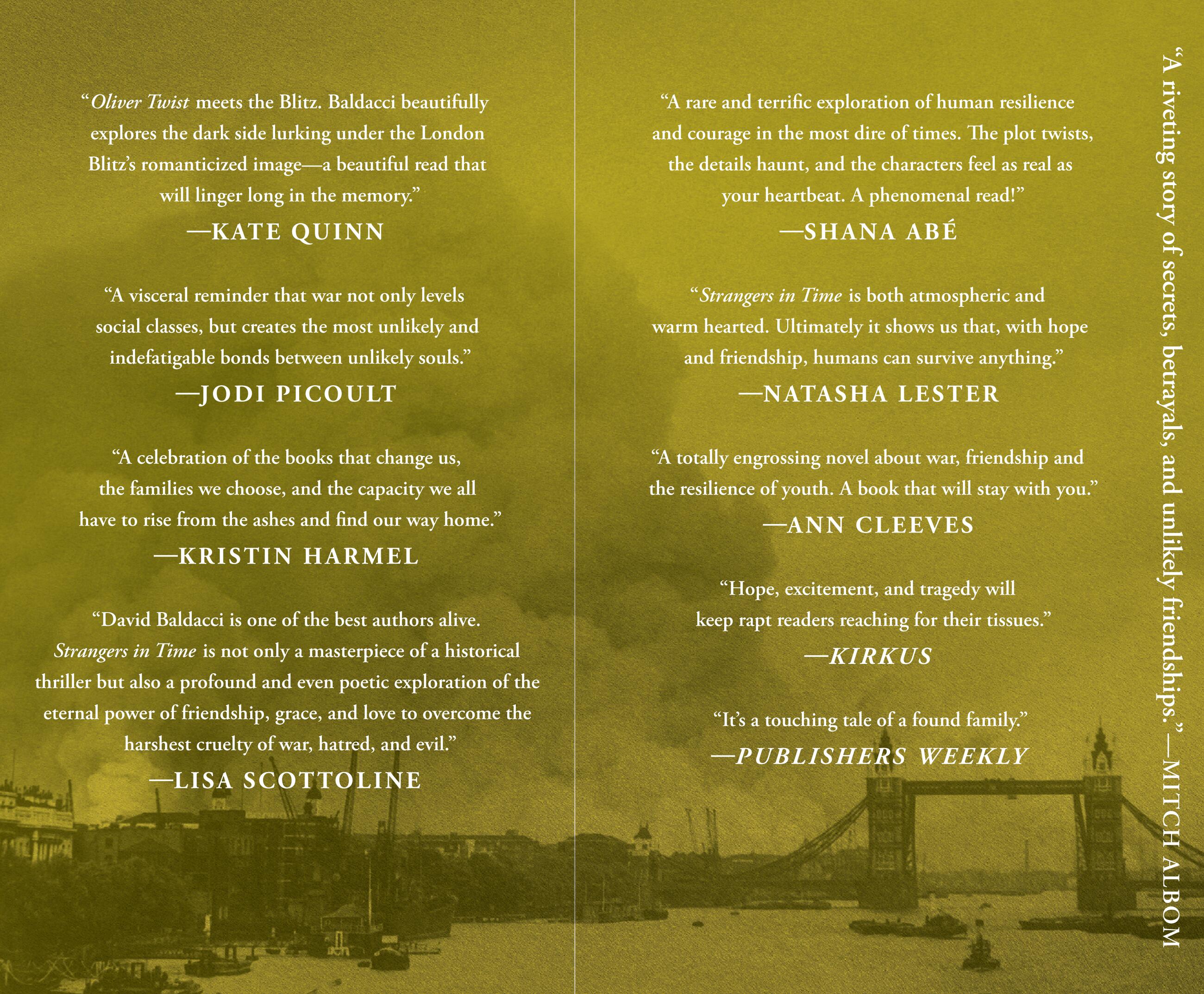 “David Baldacci is one of the best authors alive, and every page of Strangers in Time shows why. This riveting novel plunges us into wartime London through three unforgettable main characters – a young boy, a teenage girl, and a bookshop owner - who come together to endure the terrifying bombing of a city they love, and at the same time, help each other to unravel the heart-wrenching mysteries of their own families. In Baldacci’s virtuosic hands, Strangers in Time is not only a masterpiece of a historical thriller but also a profound and even poetic exploration of the eternal power of friendship, grace, and love to overcome the harshest cruelty of war, hatred, and evil.”Lisa Scottoline, #1 bestselling author
