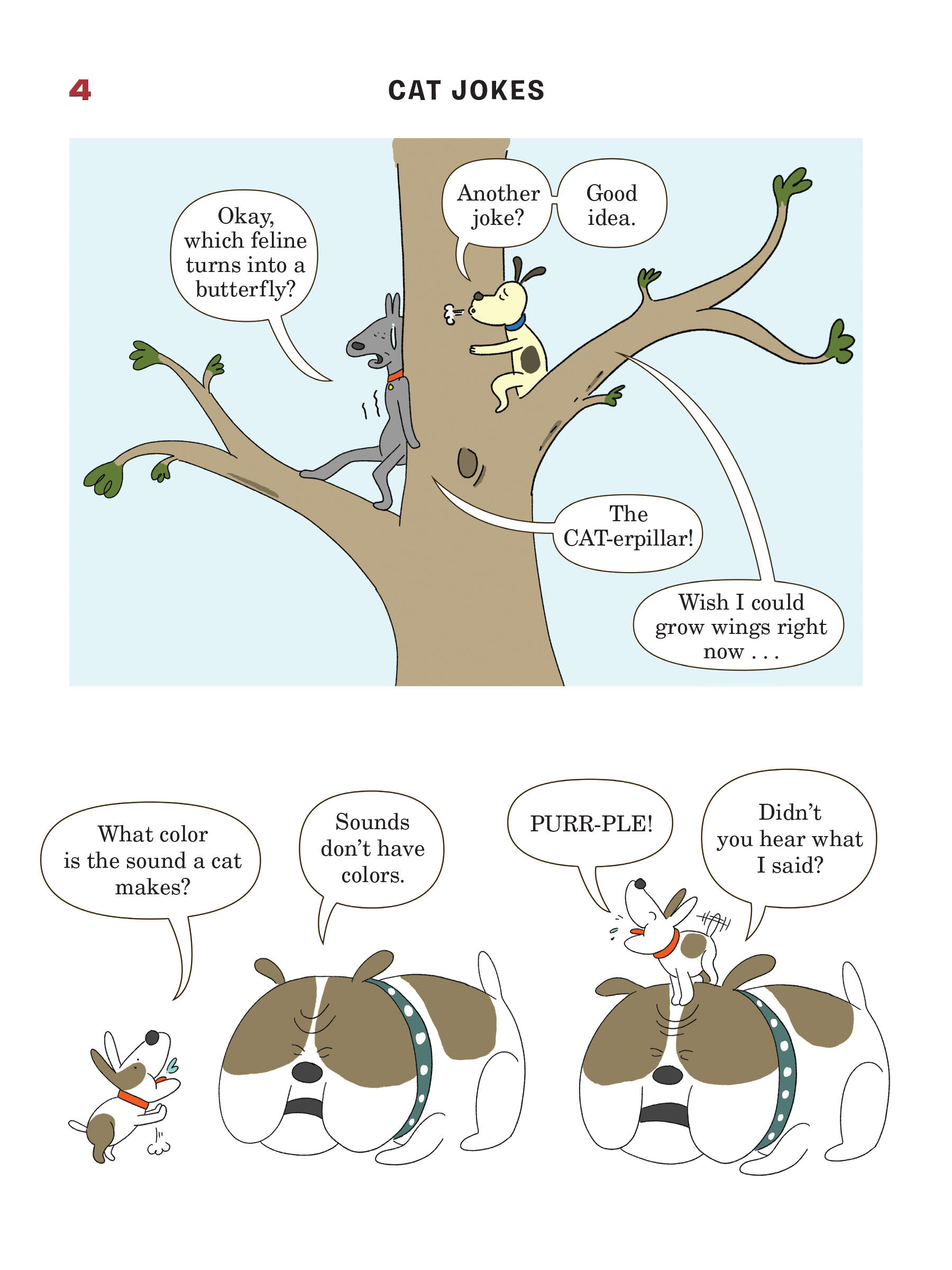 Presented in a read-from-both-sides format, the first half of the book consists of cat jokes told by a recurring cast of dogs (What do you call an insect in a cat’s bathroom? A litterbug!). Flip the book over to start from the other side, and it becomes a book of dog jokes told by cats (What’s the difference between kibble and a heavy mist? One is dog food, and the other is fog, dude!) In the middle spread, the casts of cartoon dogs and cats come together for a mid-book finale of shared giggles, snorts, and guffaws.