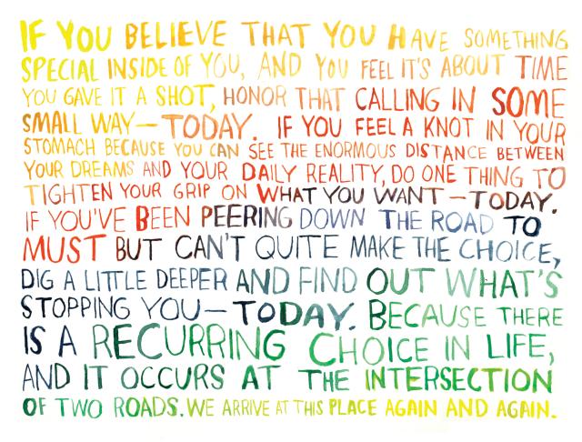 "How to turn that invisible inner fire into fuel for soul-warming bliss is what artist and designer Elle Luna explores in her essay-turned-book The Crossroads of Should and Must: Find and Follow Your Passion — an intelligent and rousing illustrated manifesto that picks up where Campbell left off, in the spirit of Parker Palmer’s emboldening guide to letting your life speakand Debbie Millman’s visual-essay-turned-commencement-address on courage and the creative life"