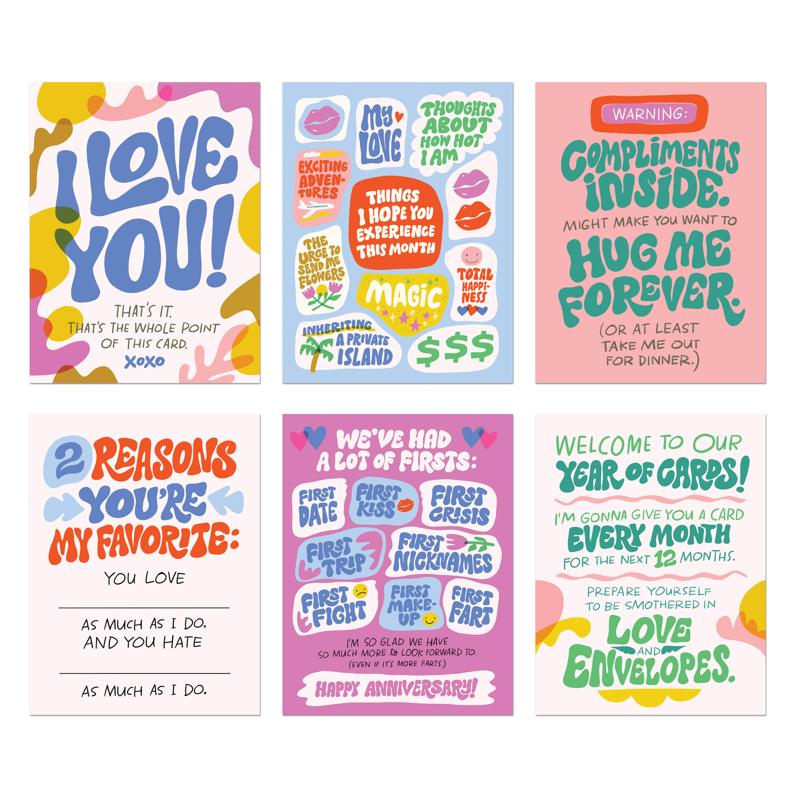 Finding ways to surprise and delight Your Person can be a challenge. Let us take care of it for you! Our new greeting cards boxed set supplies one card a month from you to your special boo (are people still saying boo?), including a birthday card!. Cute stickers make sealing the deal even sweeter. You can start sending the cards at any time.