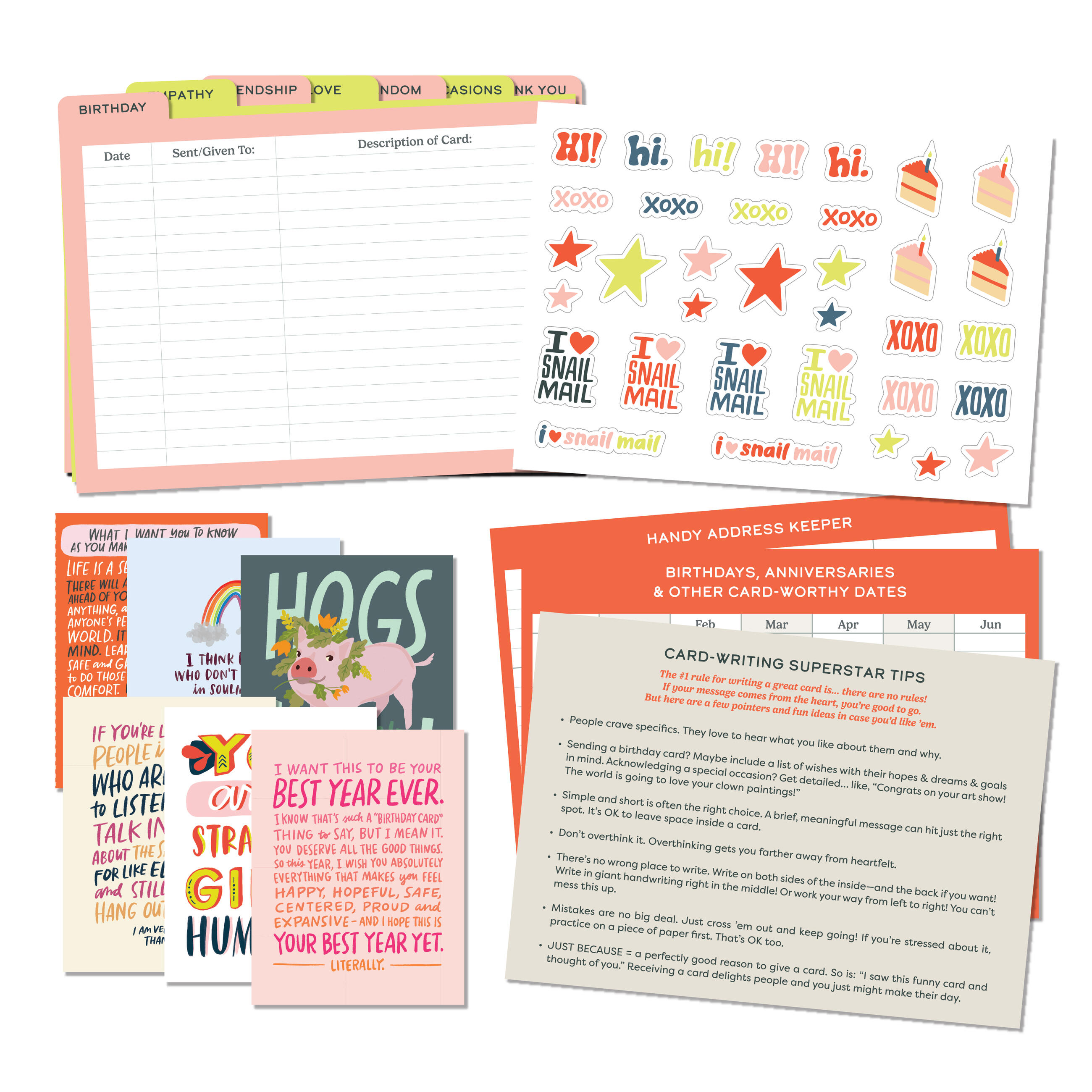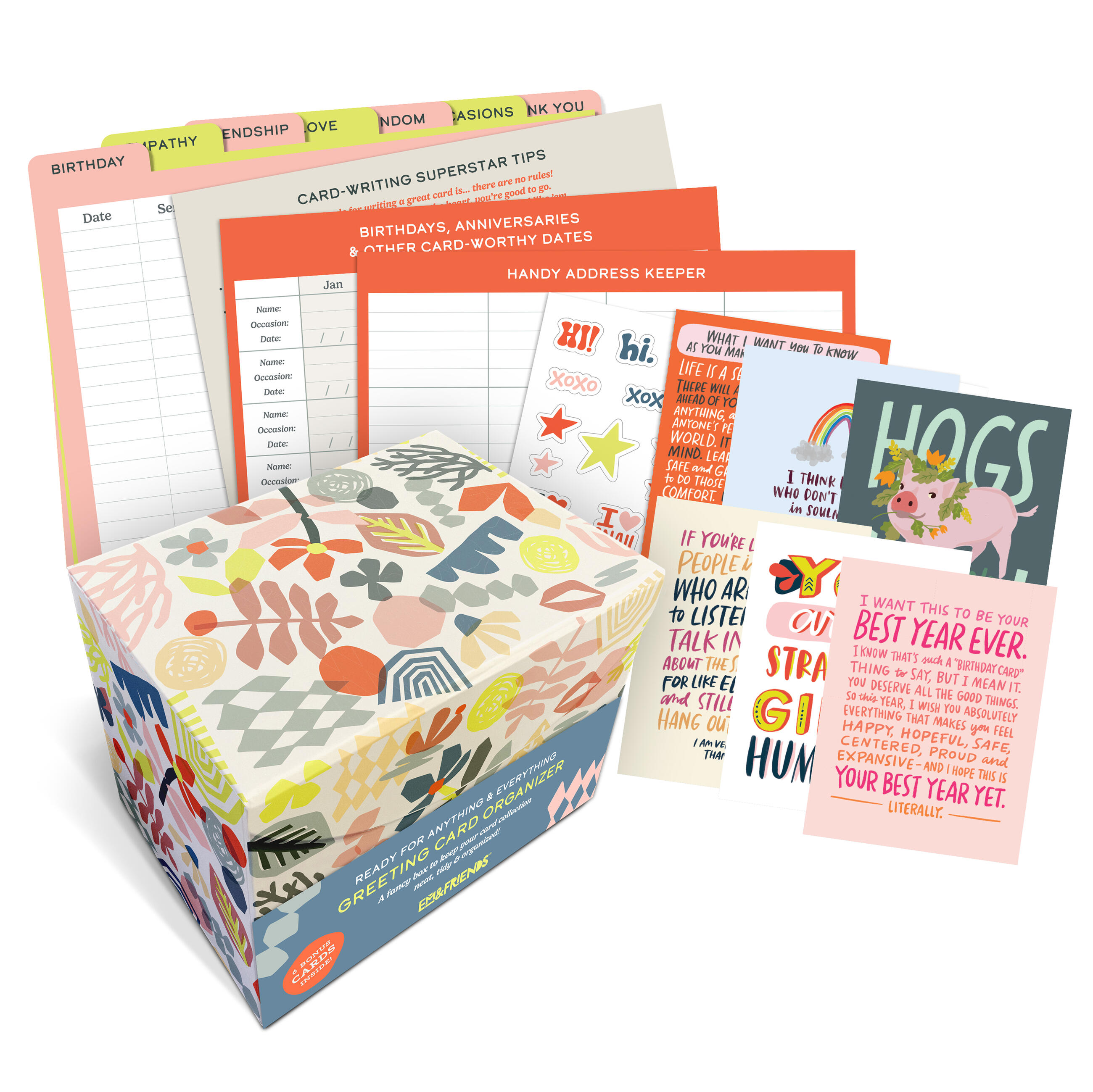 Hey, card lover! We created a box that’s like a file organizer for your cards, keeping ’em organized & safe from coffee spills & cat paws. Besides being cute and sturdy, it’s roomy enough for 60+ cards—and comes stocked with 6 EMF greeting cards! Plus it’s got stickers, tabbed dividers, and a calendar for important dates! OH YEAH, plus an address keeper, trackers to log cards you’ve sent, and tips for writing cards! Did we forget anything? Hmmmmmm… Well, it doesn’t come with a nice warm mug of tea. We thought it might spill.