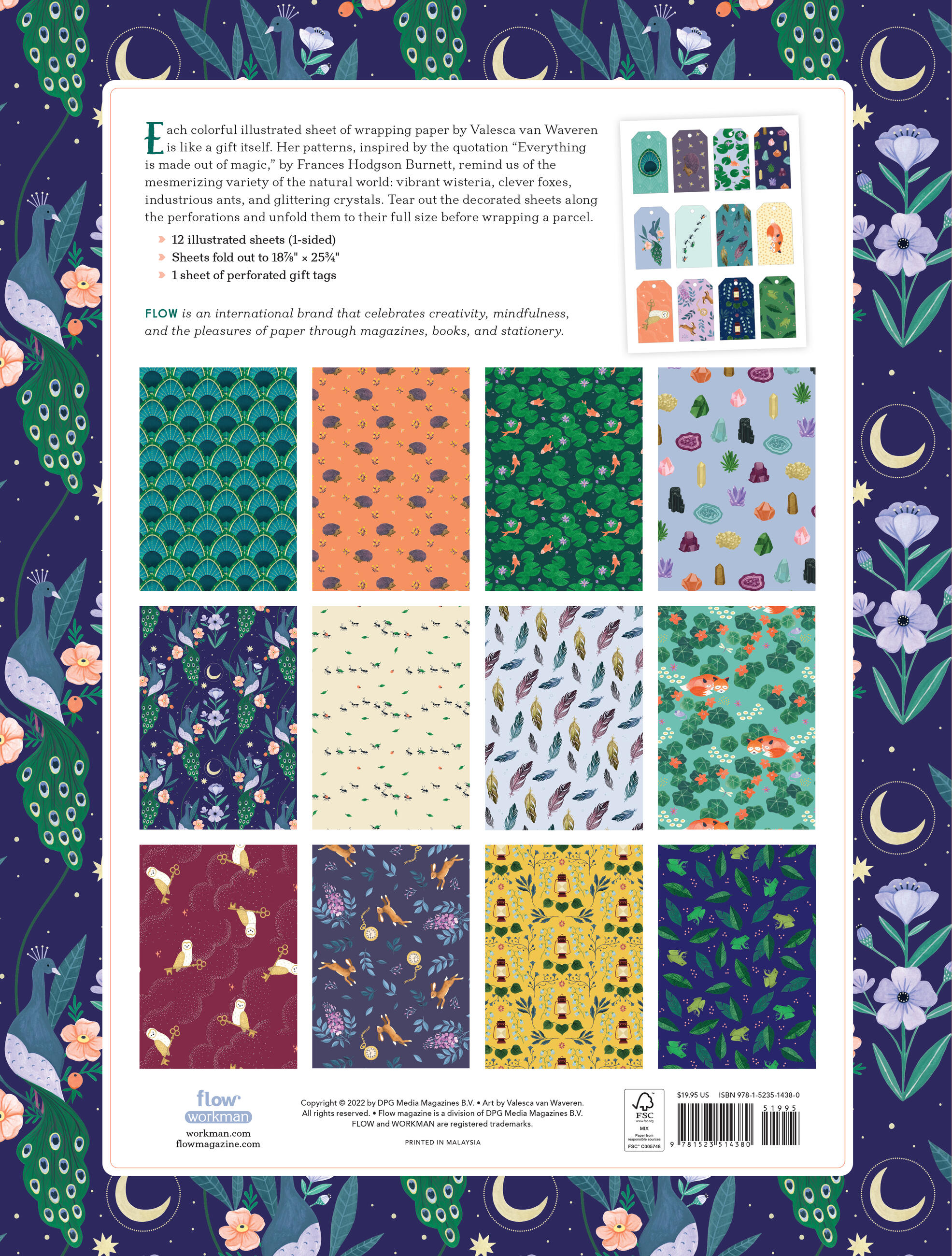 Each colorful illustrated sheet of wrapping paper by Valesca van Waveren is like a gift itself. Her patterns, inspired by the quotation “Everything is made out of magic,” by Fances Hodgson Burnett, remind us of the mesmerizing variety of the natural world: vibrant wisteria, clever foxes, industrious ants, and glittering crystals. Tear out the decorated sheets along the perforations and unfold them to their full size before wrapping a parcel.