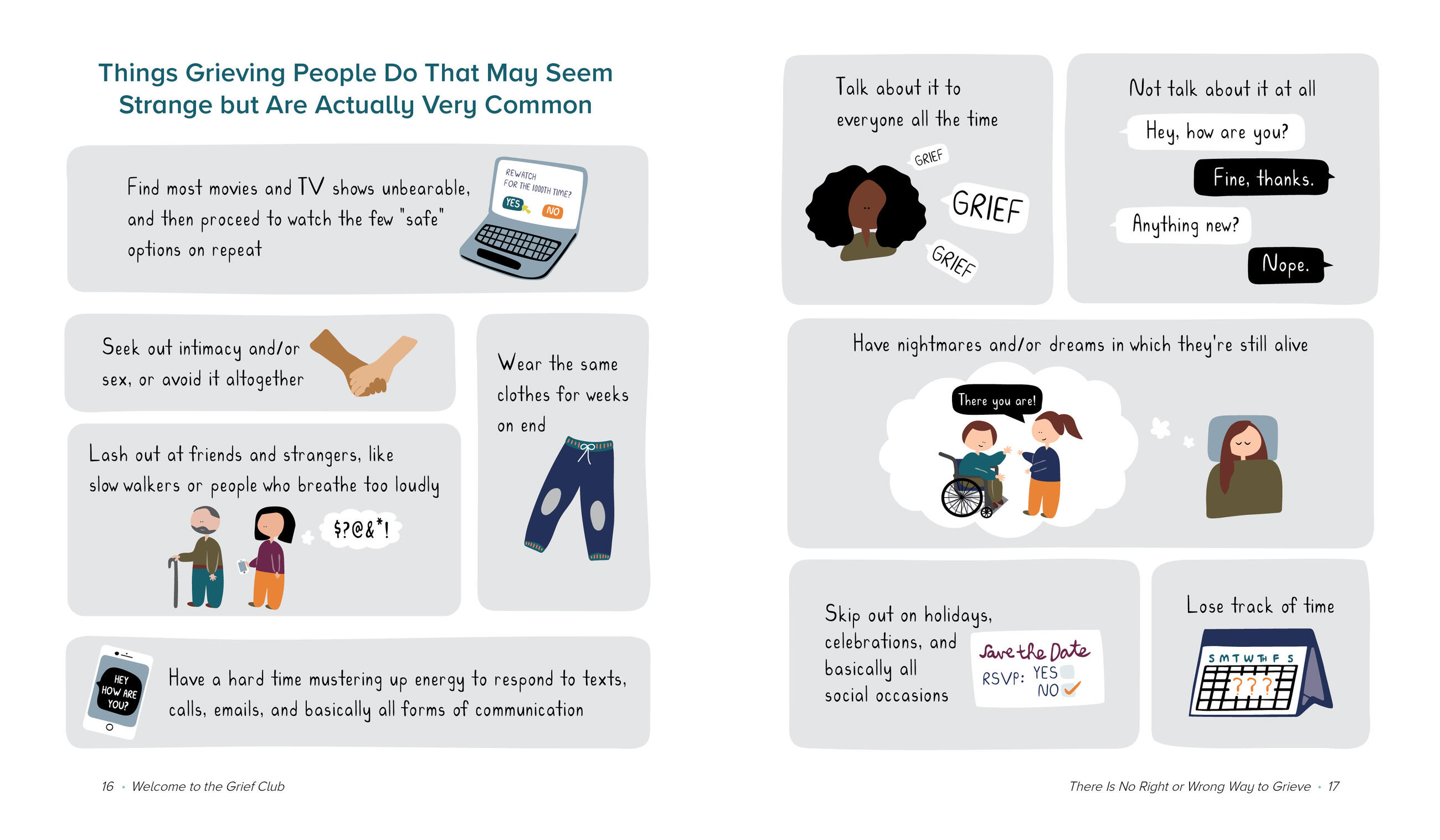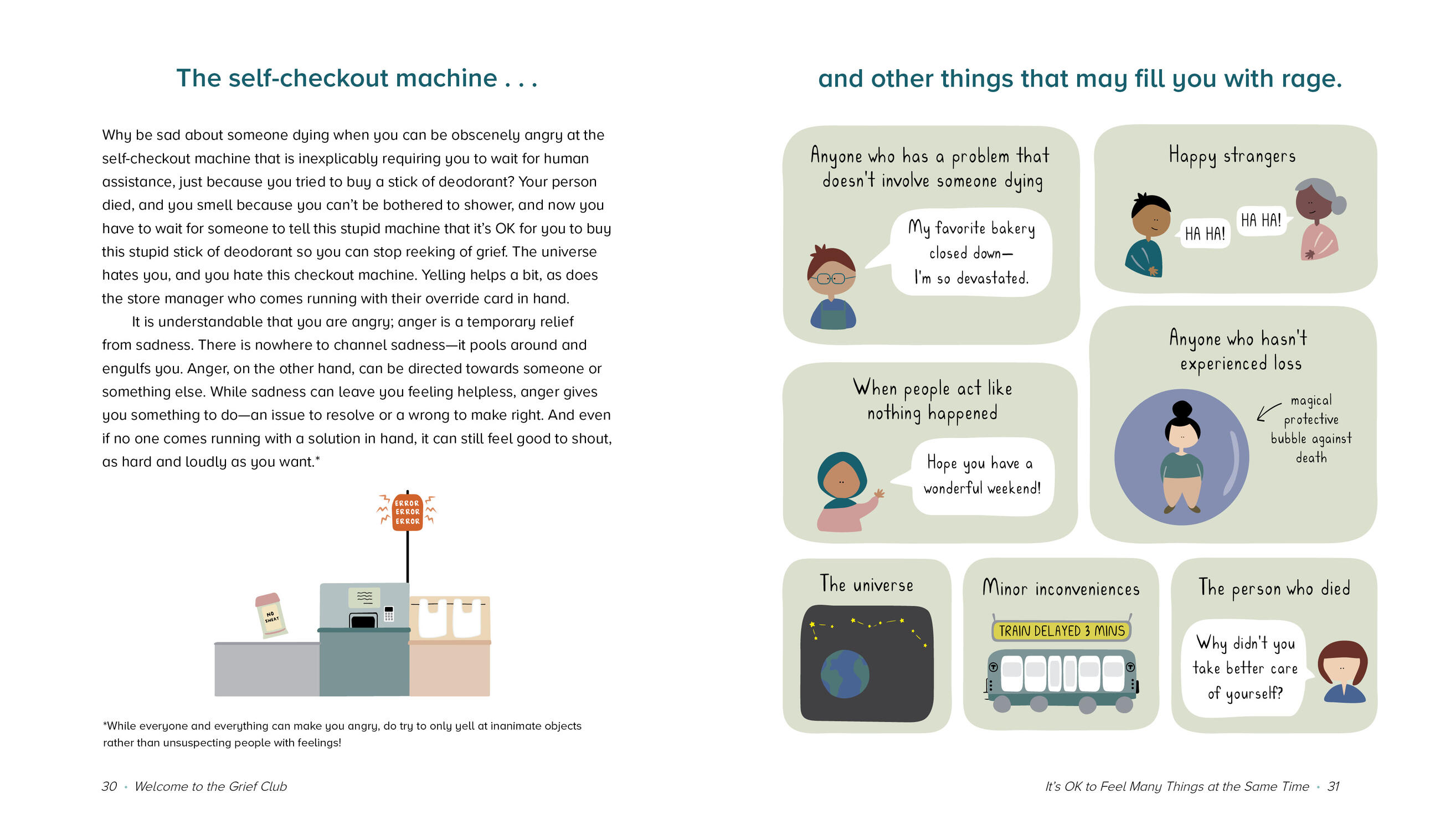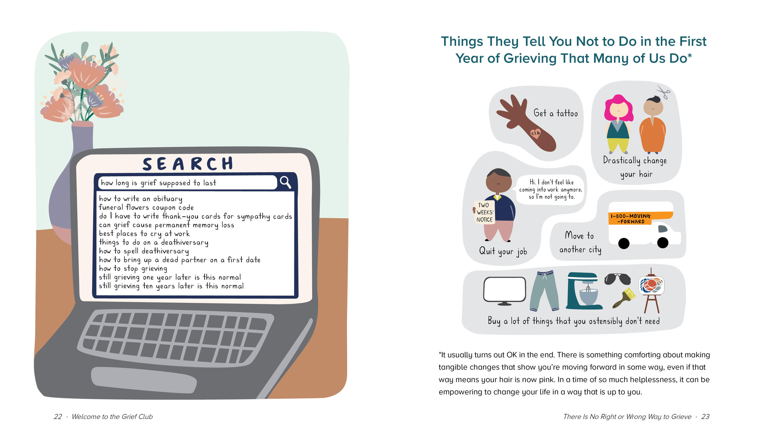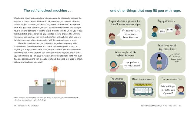 Humor helps us to survive, and the book uses a lighthearted approach to cover powerful topics, like supremely unhelpful things that people say to those who are grieving, grief trigger bingo, and everyday acts of resilience. This book is a companion that says, I see you and you are not alone, from one grieving person to another. It is a gentle reminder to give yourself permission to grieve for as long as—and in whichever ways—you need.