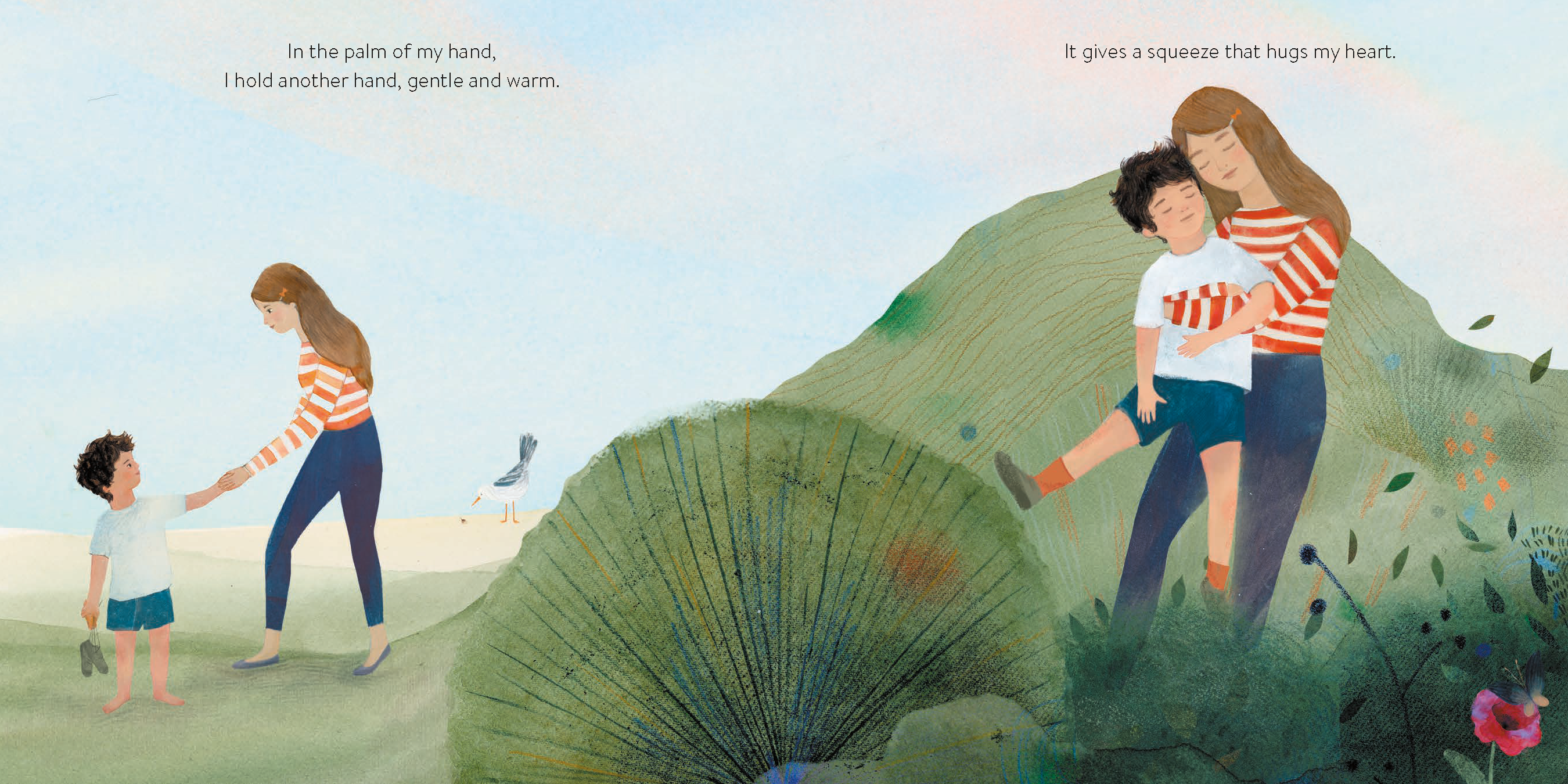 On an ambling walk, a child discovers they hold the promise of larger worlds—forests and meadows—in the palm of their hand. An acorn becomes a tree within a woodland wonderland. A grain of sand becomes a sandcastle in a kingdom of imagination. By exploring nature’s tiniest details, they learn even small things, including them, contain infinite potential.