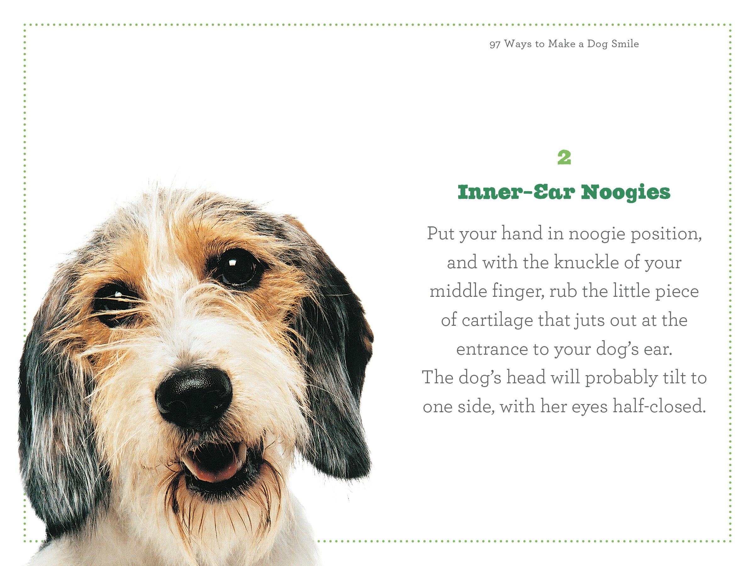 Developed by Jenny Langbehn, a veterinary nurse who has a gift for making dogs happy, here are 97 foolproof methods and tricks for putting any dog into a state of pure pleasure. Enhancing each entry is an adorable, full-color photograph of the guaranteed result—a smiling dog. Give these a try: Lower-Ear Noogies. The Thumper. Lazy Man’s Tetherball. The Hansel and Gretel—“For an afternoon of fun, scamper about the house leaving a trail of plain popped popcorn in your wake.” Or “Subliminal Game,” which works by sneaking a favorite word like “cookie” into otherwise boring jabber.*