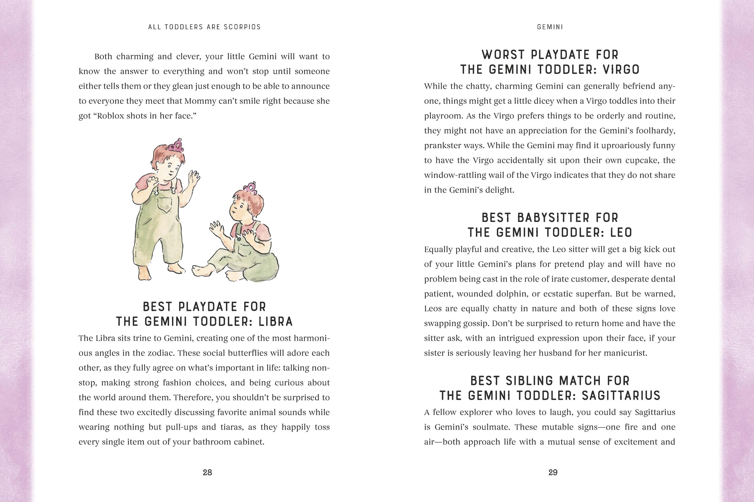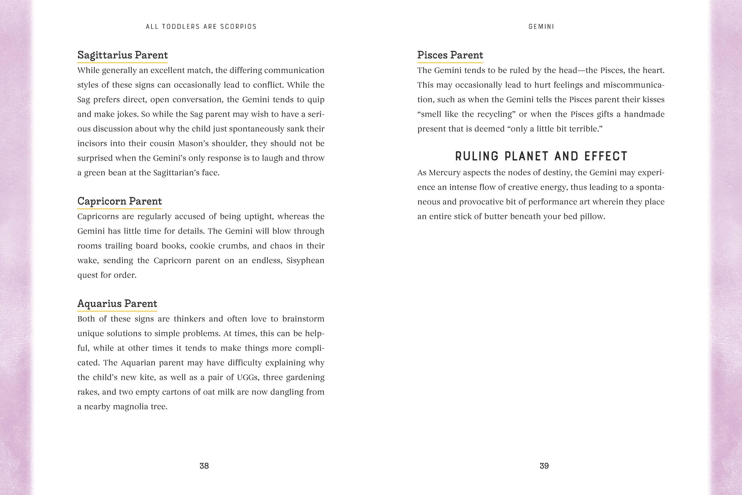 “This book is the perfect gift for anyone in the delightful throes of parenting a toddler. I wish I had All Toddlers Are Scorpios to give me a late night laugh between picking out tiny Styrofoam pieces stuck in the shag rug (my toddler wanted to make it snow inside) and sweetly snuggling before getting my boob side-punched.”Lennon Parham, actor, writer, director, PLAYING HOUSE and SOMEBODY SOMEWHERE