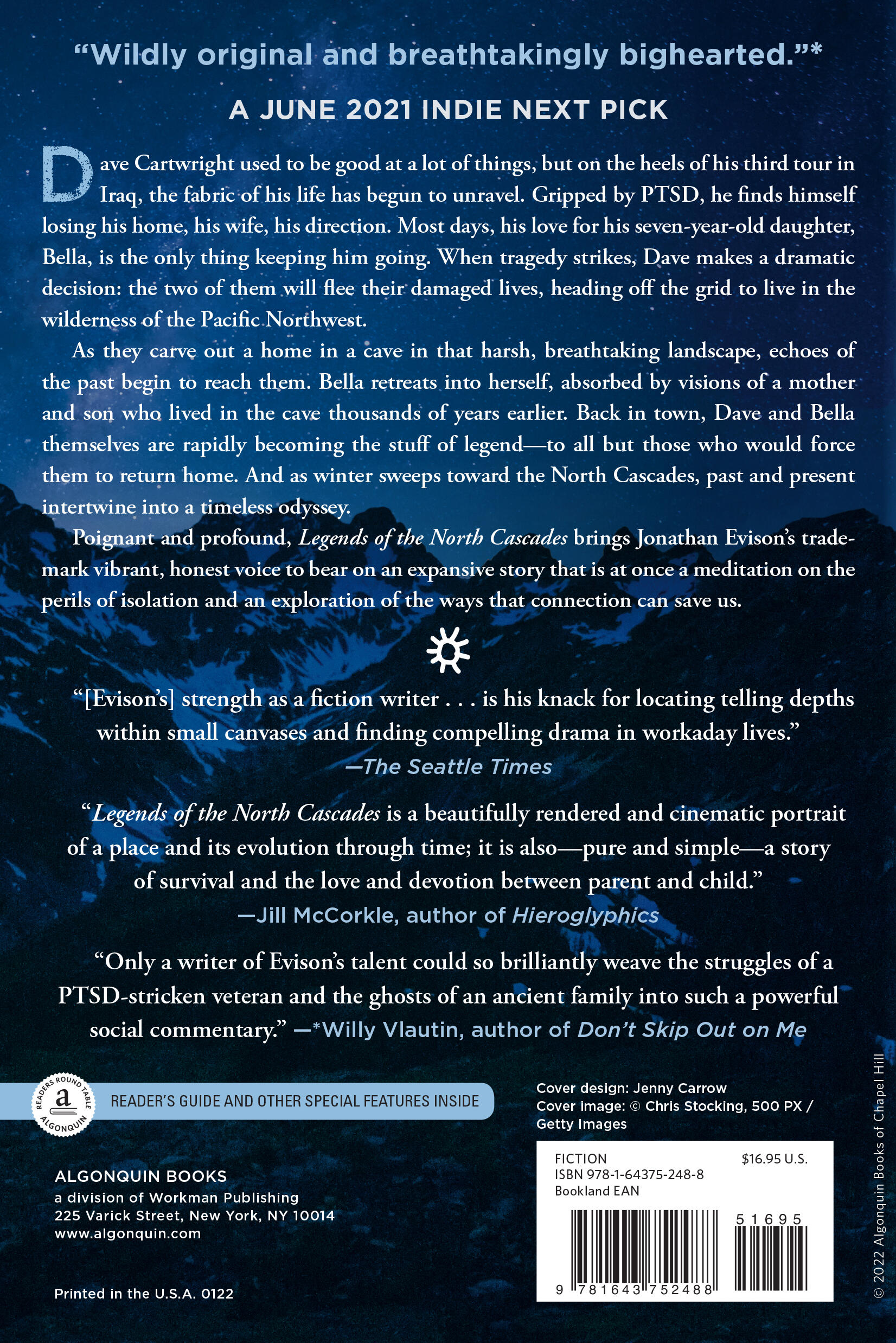 “Evison’s majestic and panoramic latest conjures the beauty, power, and unforgiving nature of the Cascade Mountains in alternating narratives separated by thousands of years. Evison masterfully delivers a subtle yet pointed commentary on how society marginalizes veterans and how we profess to admire yet distrust the individualist ethos while also offering a profound meditation on the human spirit.”