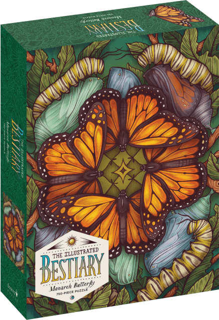 This 750-piece jigsaw puzzle highlights the beauty and resilience of Monarch’s Butterfly’s (Danaus Plexippus) metamorphosis as described in Maia Toll’s best-selling book The Illustrated Bestiary.