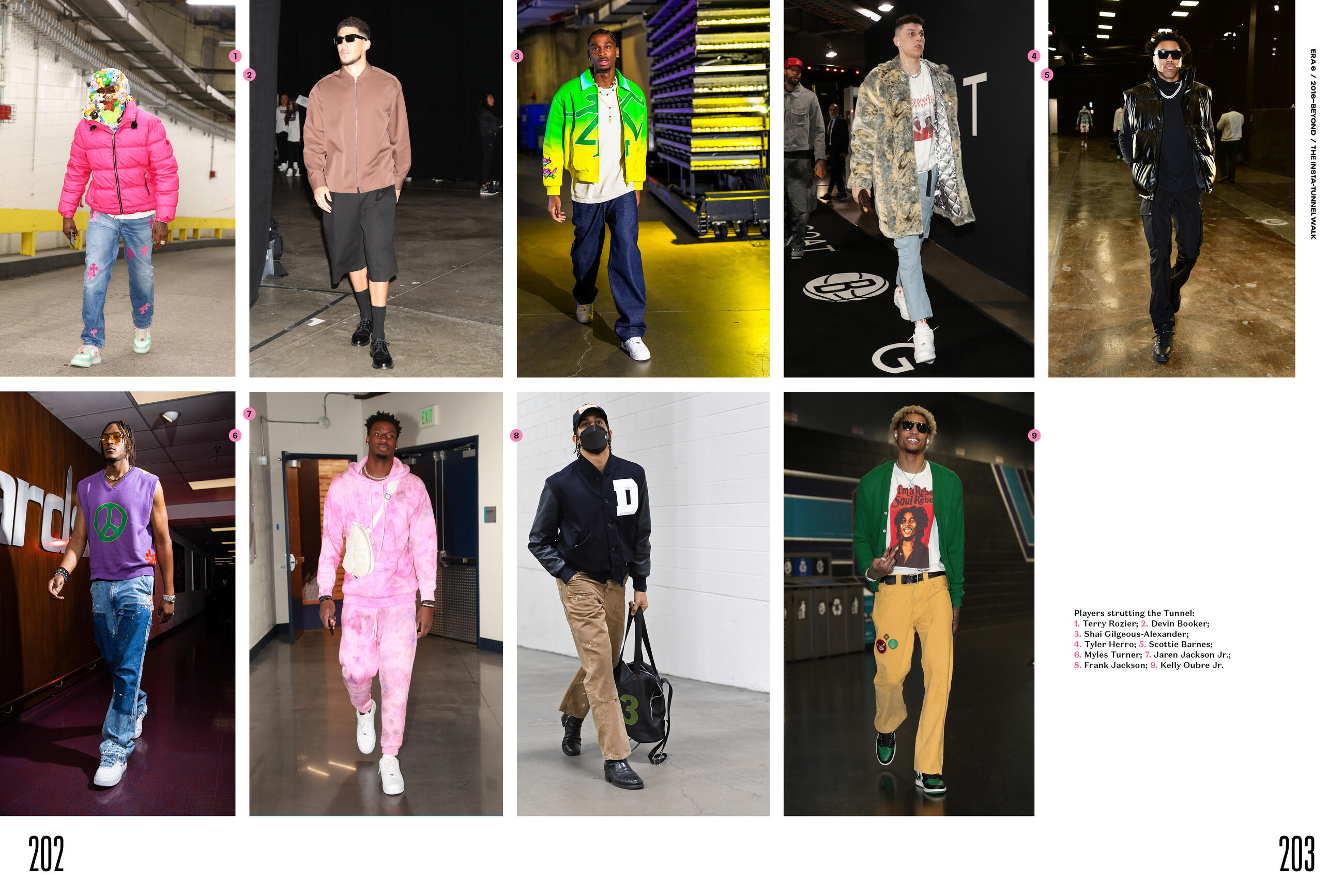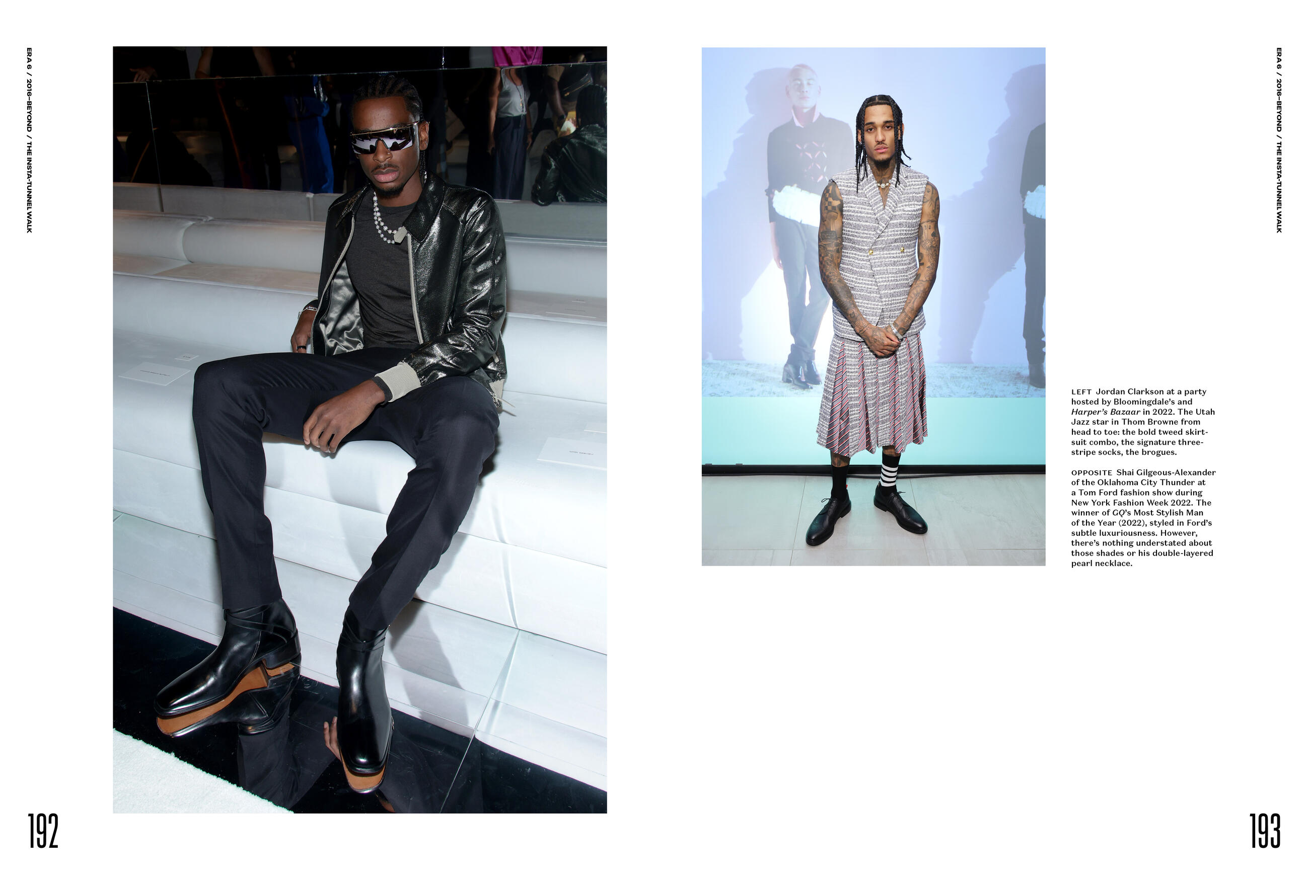 Each chapter explores the style of an era and the cultural influences that shaped it: The league’s inception in 1949, pre-Civil Rights Movement, when the NBA was mostly comprised of white players who wore suits and skinny ties. The years following the Civil Rights Act of 1964 and the birth of funk and R&B when basketball fashion got flashier (think Walt “Clyde” Frazier and Wilt Chamberlain wearing fur coats and big hats). The Michael Jordan era of the 1980s and 1990s, with its oversize suits. The epic Iverson/Hip-Hop years of the late 1990s and early 2000s. And now to today, a time defined not only by social media and high fashion’s birthing of the tunnel walk (think LeBron James, Dwyane Wade, and Russell Westbrook), but one in which athletes are idealized as style icons and activists, figures who inspire conversations beyond how they play and what they wear.