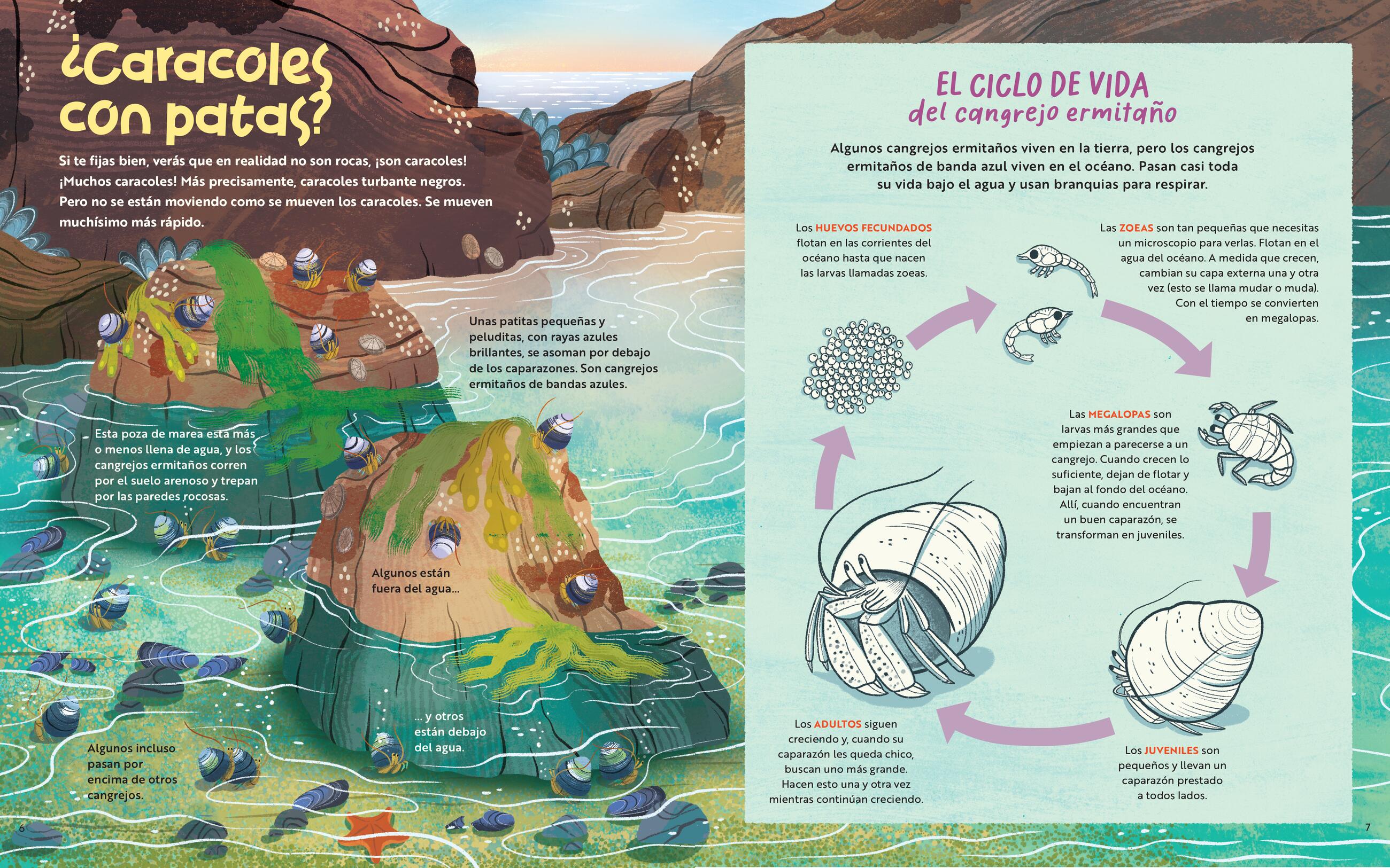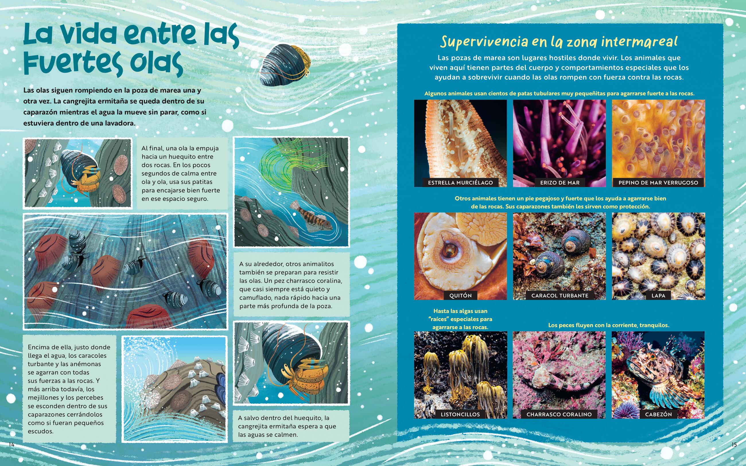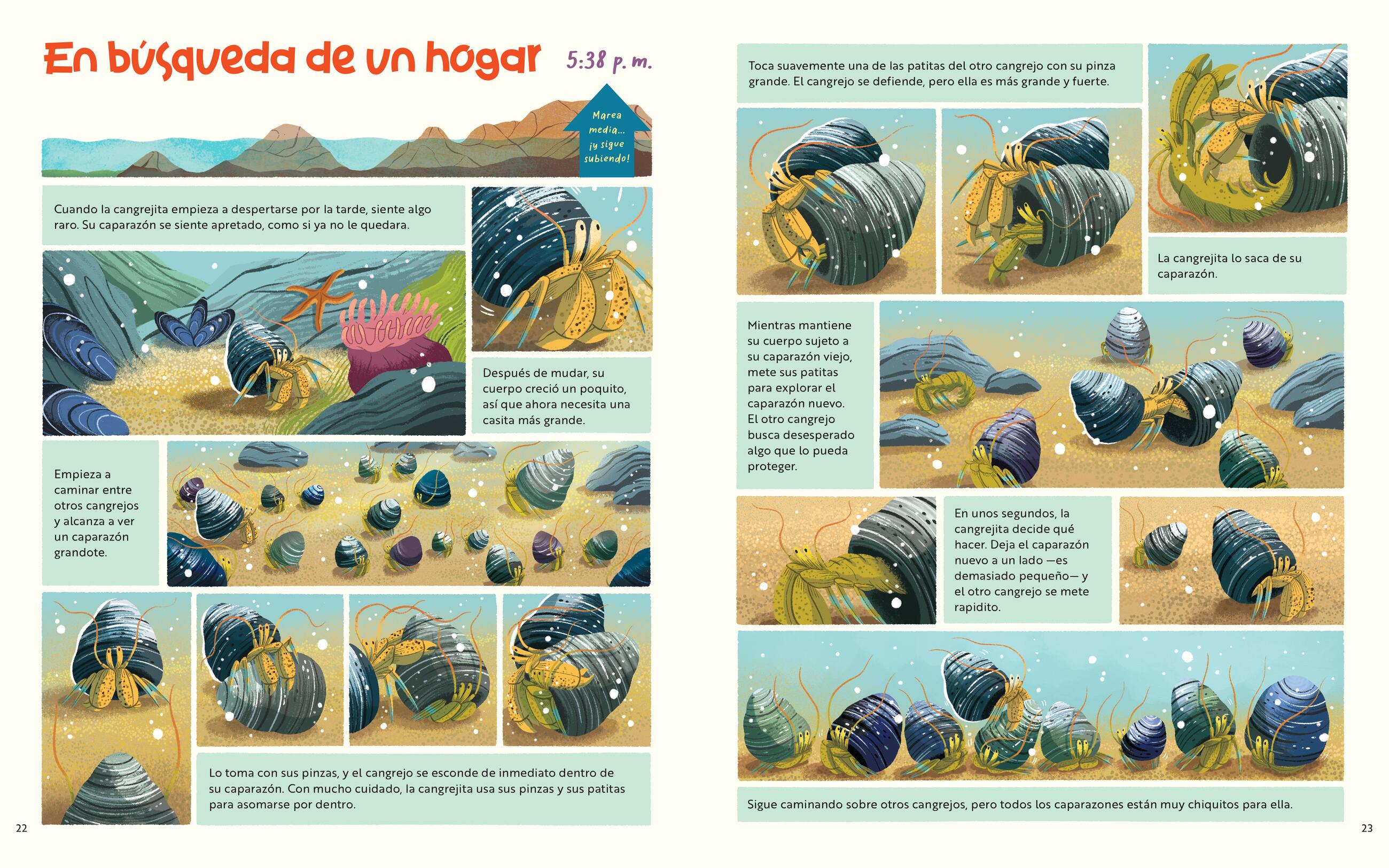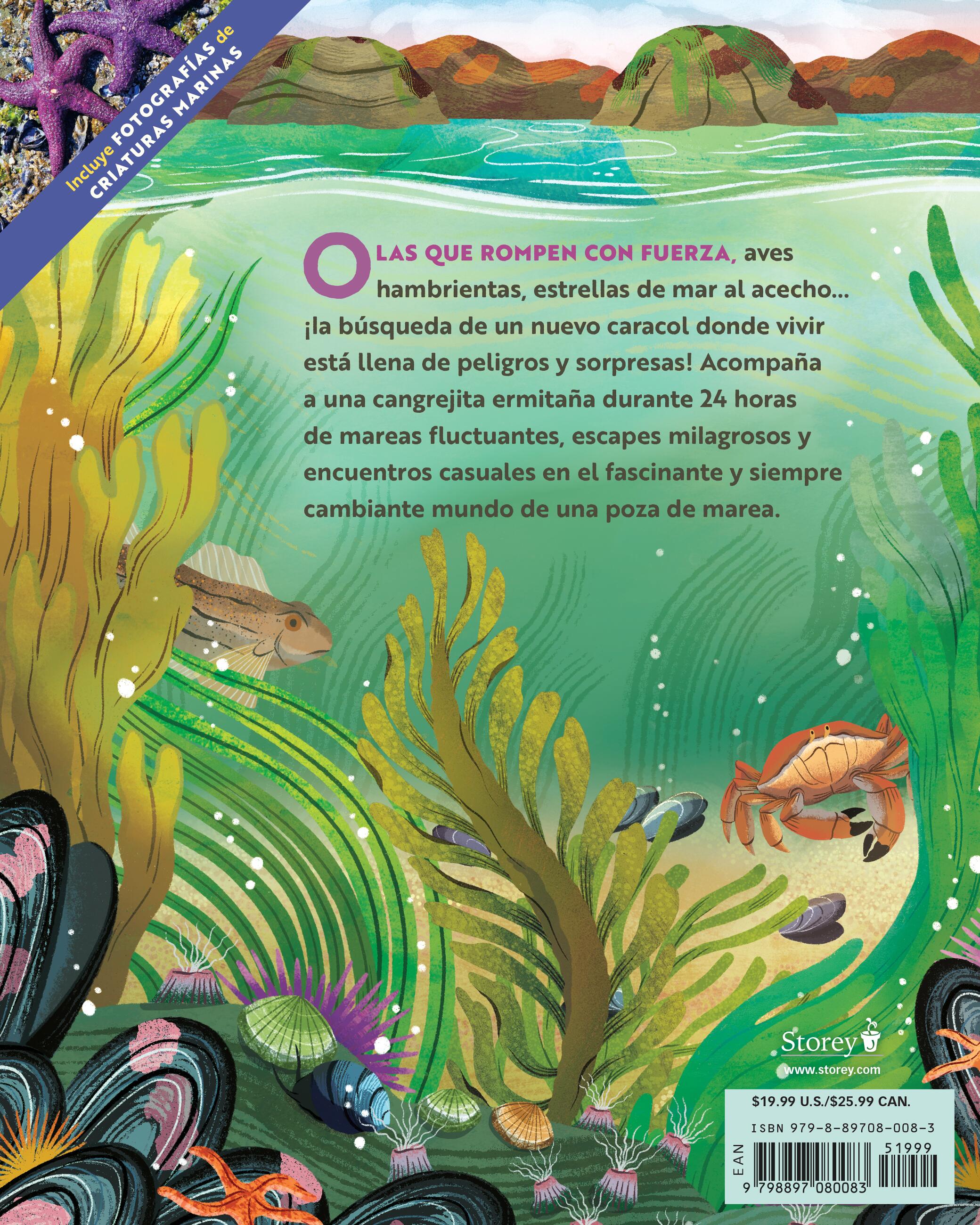 En una gran poza de marea de la costa central de California, lo que a simple vista parece solo un grupo de rocas se llena de color y emoción cuando una cangrejita ermitaña comienza la búsqueda de una casa más grande. A lo largo del ciclo de las mareas, deberá enfrentarse a condiciones extremas: olas que golpean con fuerza, depredadores hambrientos y un vecindario lleno de criaturas sorprendentes, todo mientras intenta encontrar su nuevo hogar. A través de hermosas ilustraciones y fotografías reales, los lectores aprenderán sobre las adaptaciones de muchas especies, por qué ocurren las mareas, cómo funciona la red alimentaria de las pozas de marea y mucho más.