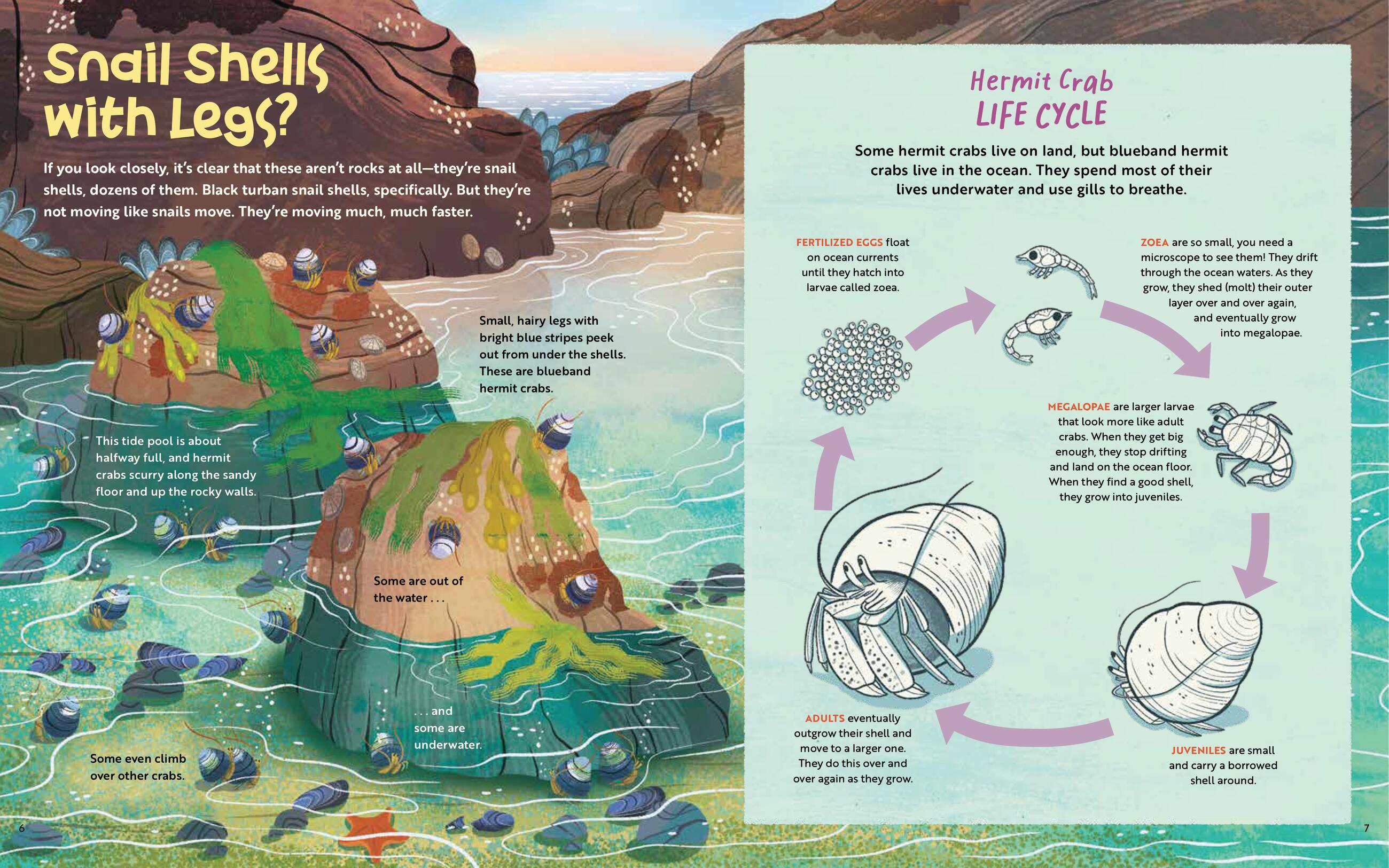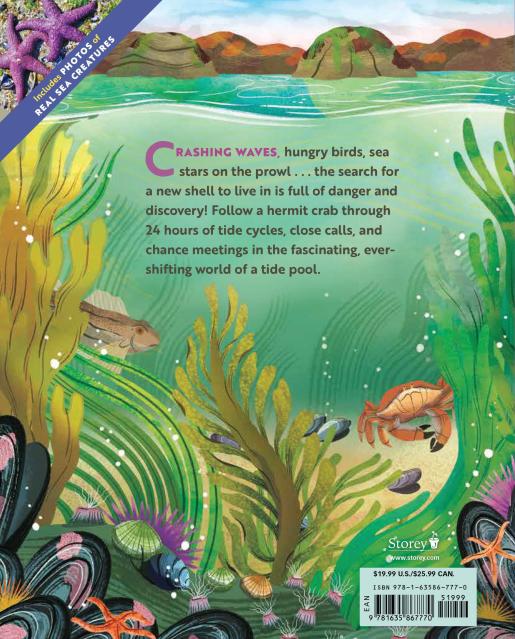 In a great tide pool along the central coast of California, what from afar looks like just a rocky outcropping comes to life with color and drama as a hermit crab searches for a new, larger shell. The crab must survive extreme conditions through the course of a tide cycle–encountering crashing waves, hungry predators, and a neighborhood of diverse animals–in order to find her new home. While following the crab’s story through gorgeous, paneled illustrations, readers will also learn about the adaptations of a wide variety of creatures, why tides happen, the tide pool food web, and more through sidebars and photos.