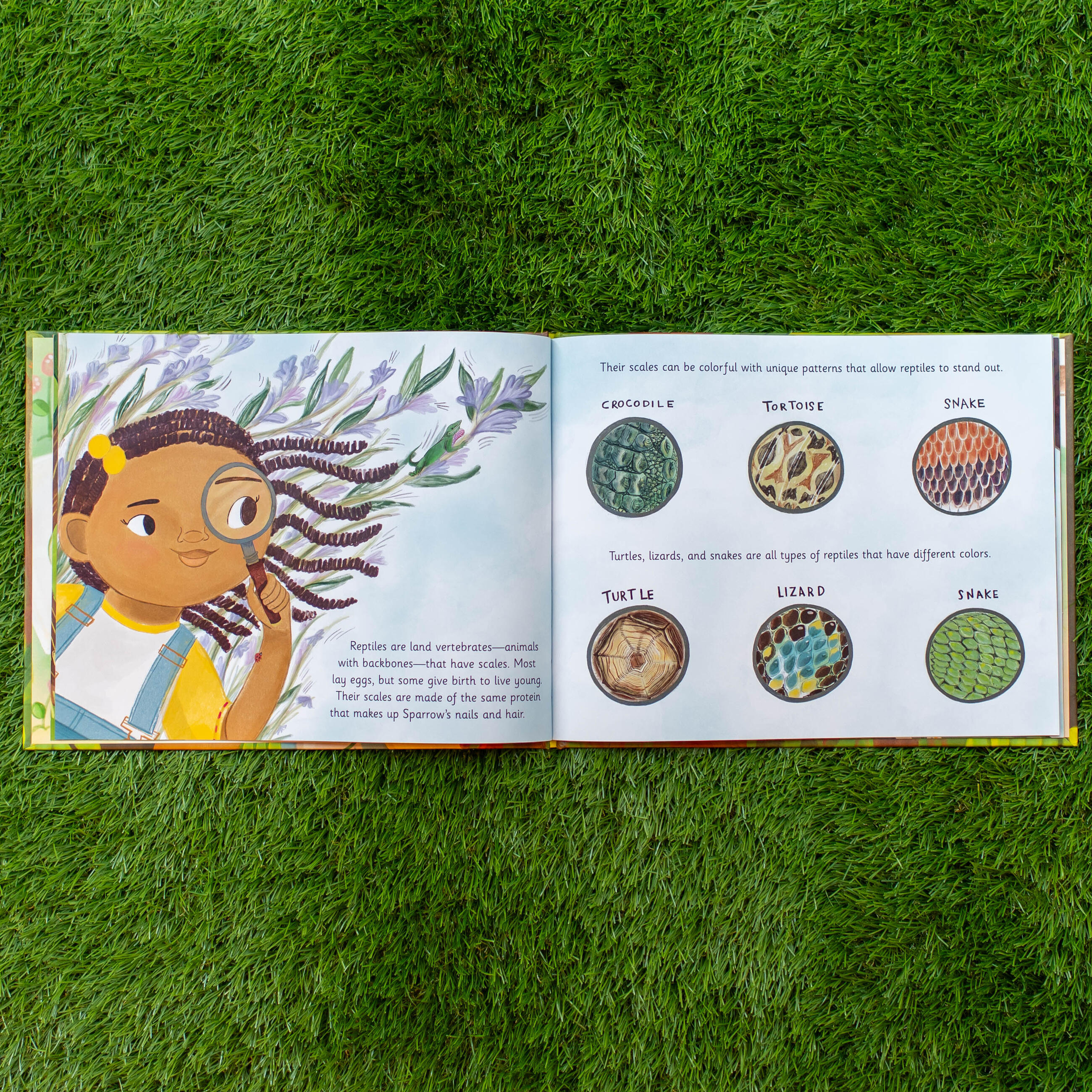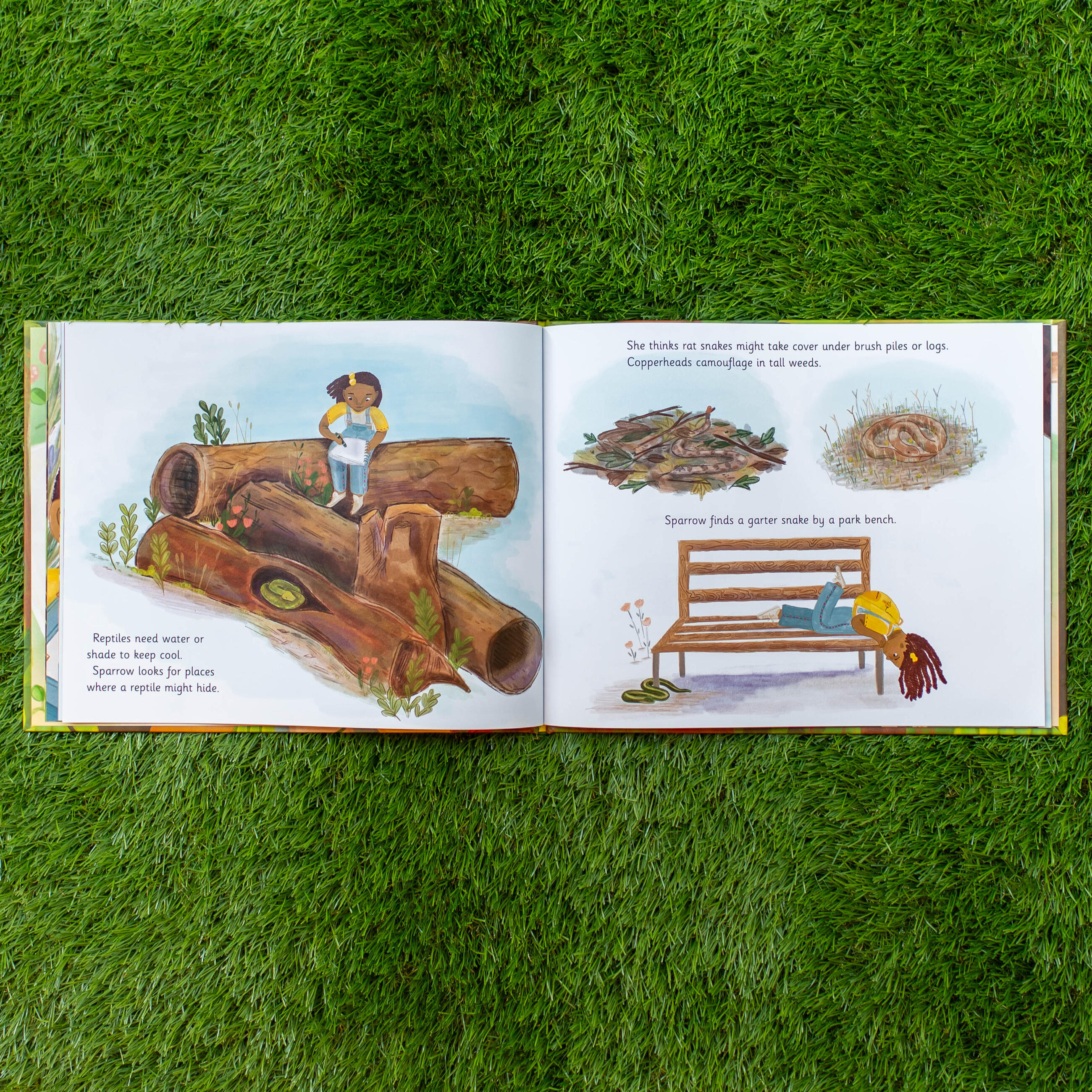 Sparrow is always curious. She loves to go outside and search for animals, drawing her findings in her sketchbook. Today, she’s looking for reptiles that slither, creep, and crawl. But these camouflaged animals are not always easy to spot as they blend into their surroundings. Luckily, Sparrow is patient as well as eager to learn more about the lizards, turtles, and snakes that inhabit the park in her neighborhood.