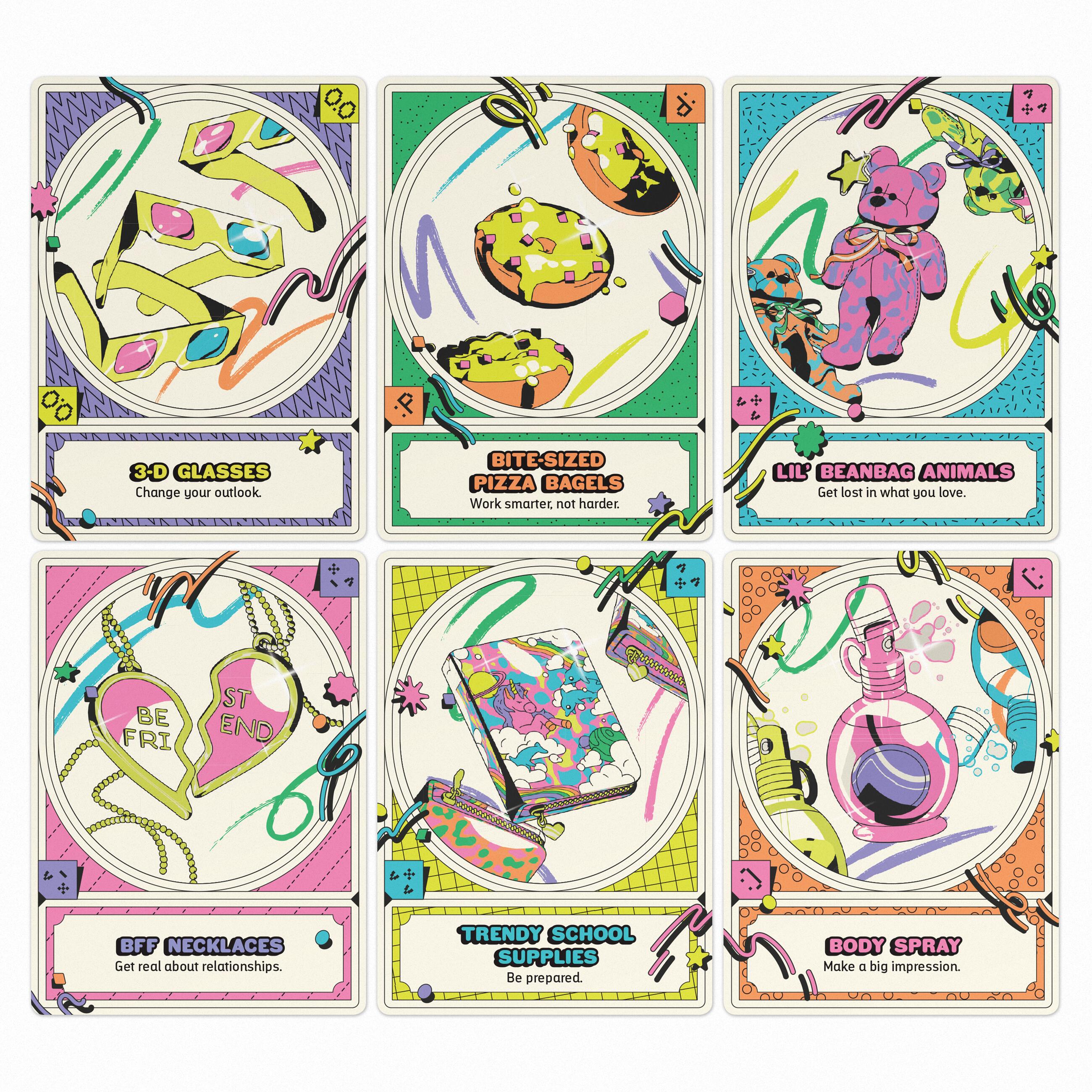 Each exuberantly illustrated card represents an object from ’80s/’90s kid culture, and assigns it specific talismanic meaning.