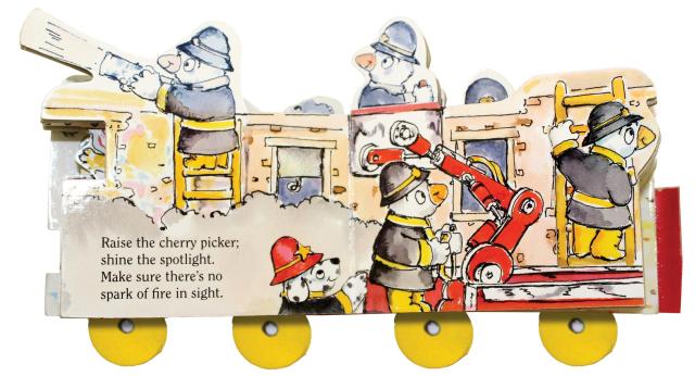 Chunky, colorful, and lively, with doors that open and windows to explore, packed with adorable characters and rhyming action, Mini Wheels Books are a delightful ride through the reader’s imagination.