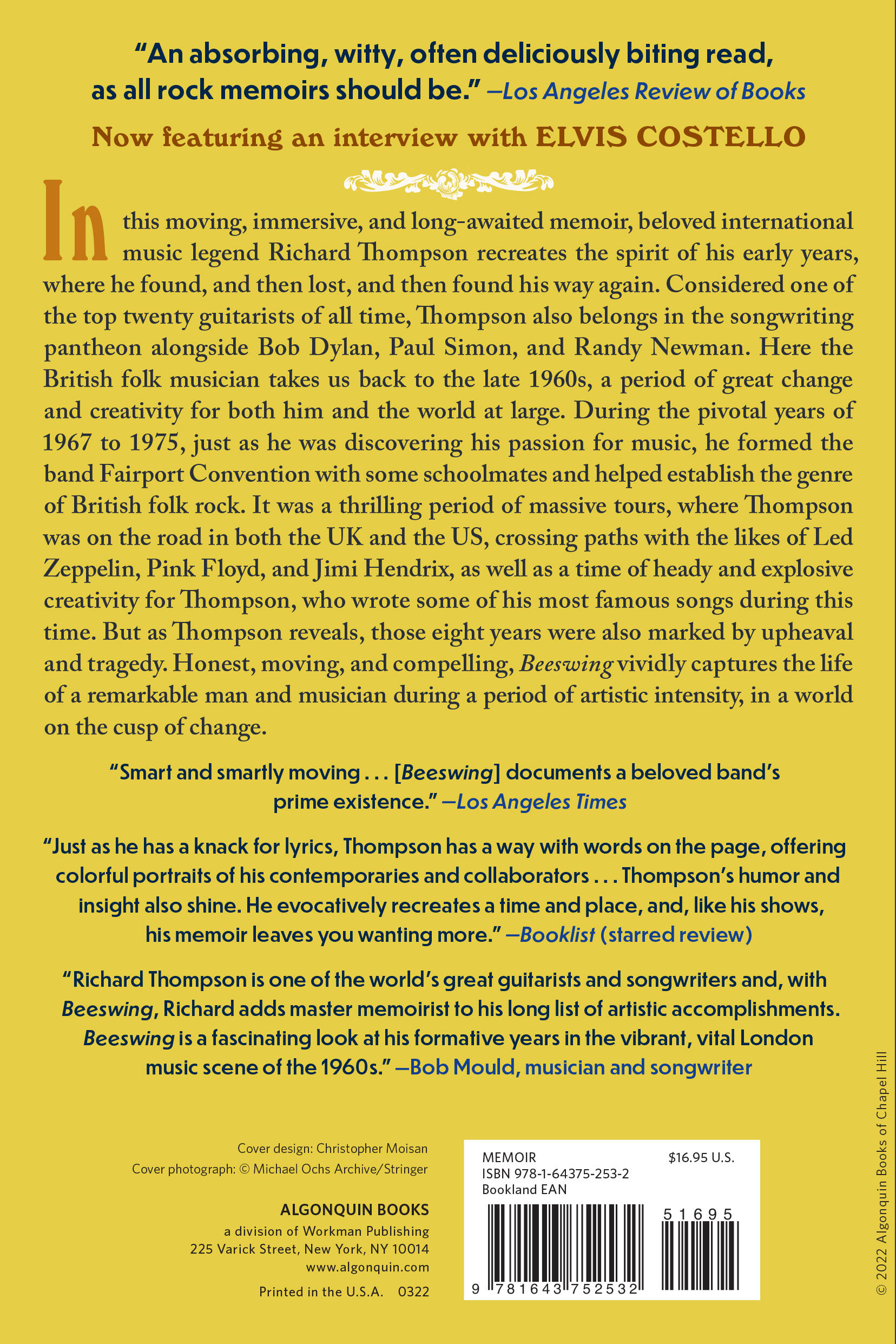 “More than a typical celebrity memoir, Beeswing is thoughtful, well written and at times very funny. With his sophisticated songs and distinctive guitar work, Thompson, 72, has long been the thinking person's musician. Turns out he's also the thinking person's memoirist.”