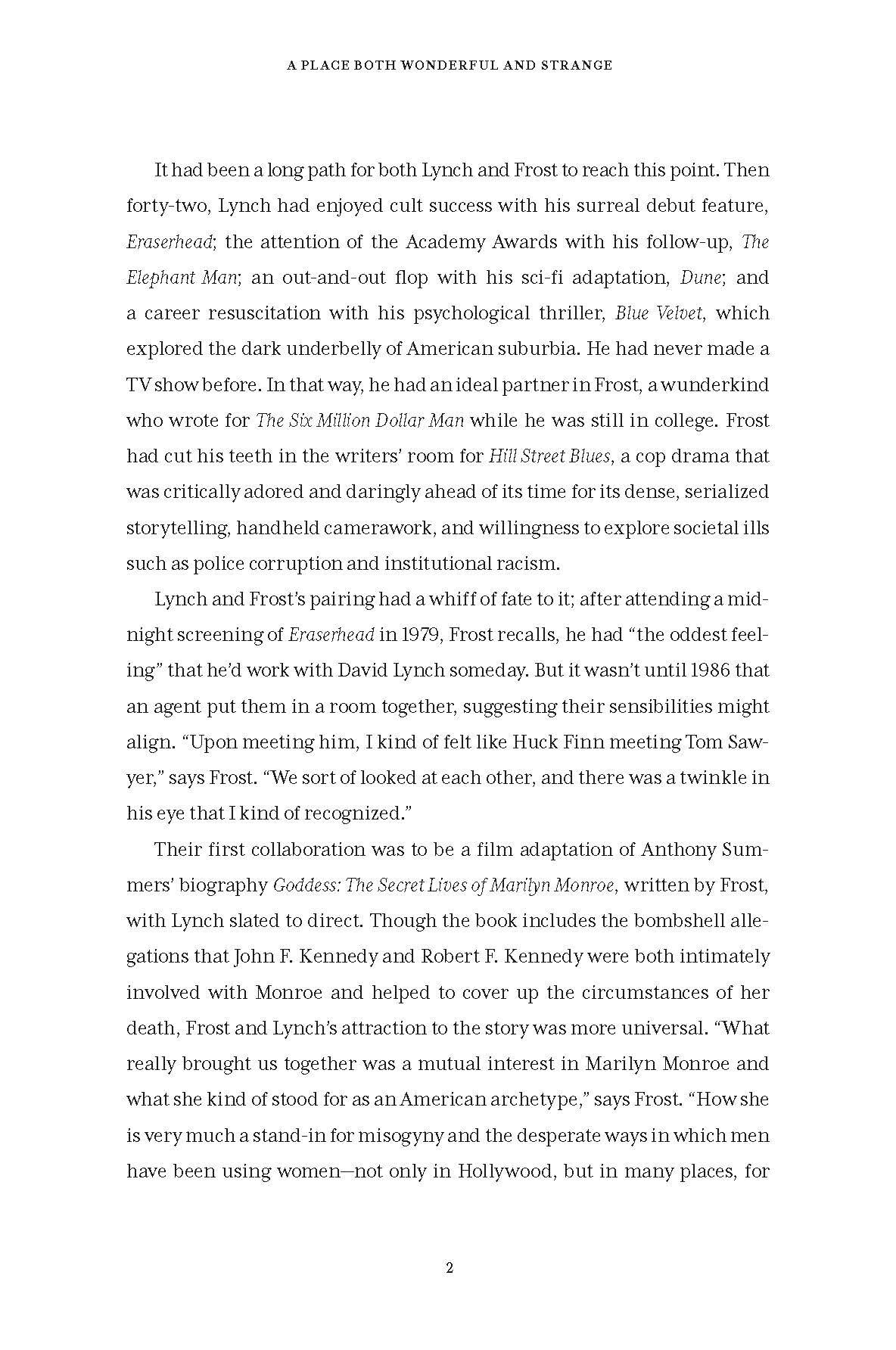 In A Place Both Wonderful and Strange, entertainment reporter Scott Meslow takes readers behind the curtain of Lynch’s and Frost’s dedication to finishing what they started, with both the prequel film and Showtime’s Twin Peaks: The Return, offering dozens of original and revelatory interviews that cast a whole new light on the extraordinary show. Twin Peaks fans will discover how hard the mercurial Lynch and affable Frost fought impatient ABC execs (ultimately losing) to keep Laura Palmer’s murder unsolved, as well as the omerta-like secrecy around the filming of the show. For a series that left as many questions unanswered as answered, Meslow’s deep reporting will give readers a new perspective, detailing scenes left on the cutting–room floor and how Season Two’s finale stunned and infuriated studio execs in what Mark Frost calls “a defiant middle finger to what they [studio executives] thought the show should be.”