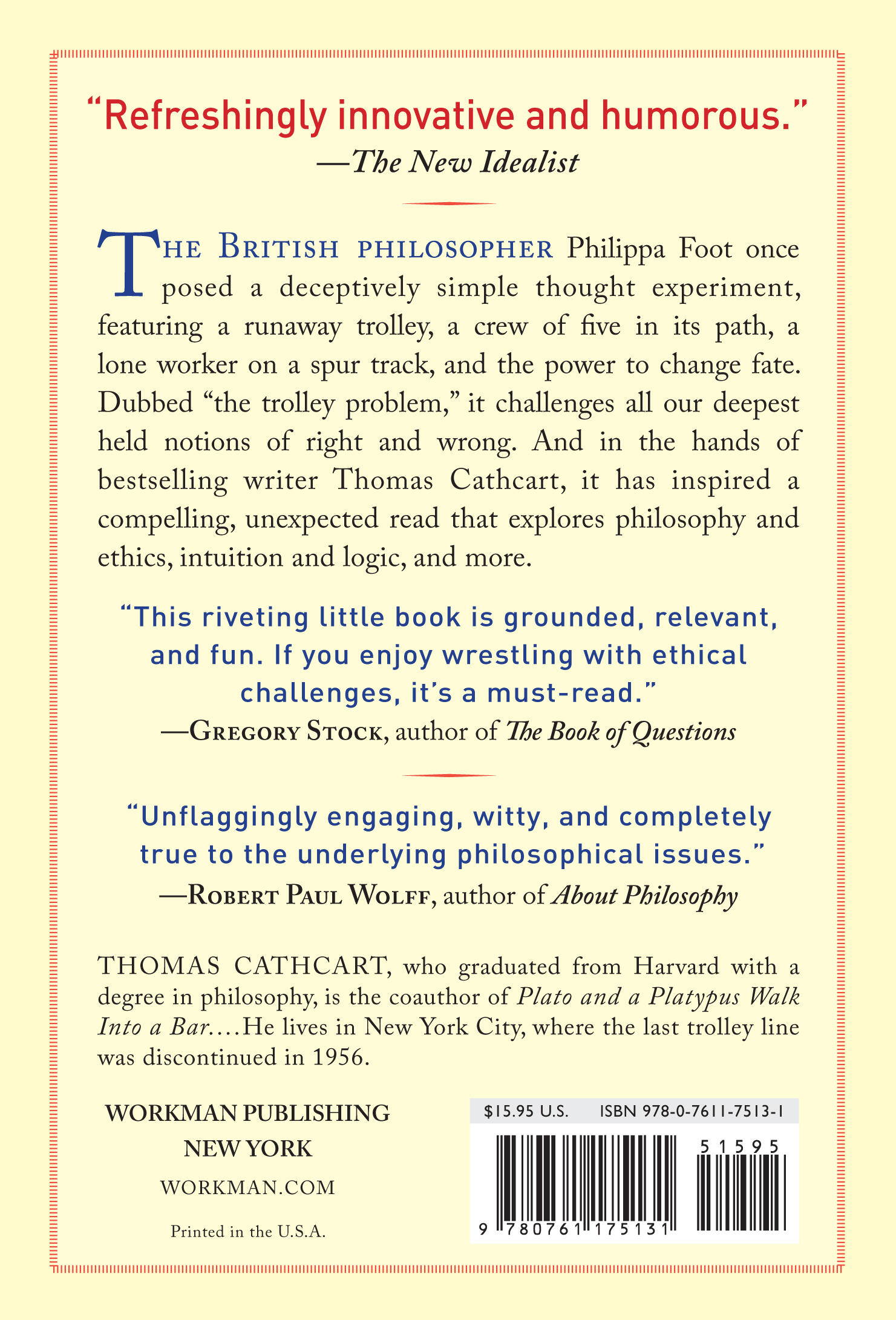 This ethical conundrum—based on British philosopher Philippa Foot’s 1967 thought experiment—has inspired decades of lively argument around the world. Now Thomas Cathcart, coauthor of the New York Times bestseller Plato and a Platypus Walk into a Bar, brings his sharp intelligence, quirky humor, and gift for popularizing serious ideas to “the trolley problem.” Framing the issue as a possible crime that is to be tried in the Court of Public Opinion, Cathcart explores philosophy and ethics, intuition and logic. Along the way he makes connections to the Utilitarianism of Jeremy Bentham, Kant’s limits of reason, St. Thomas Aquinas’s fascinating Principle of Double Effect, and more.