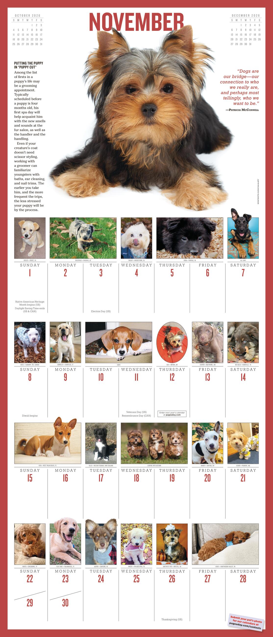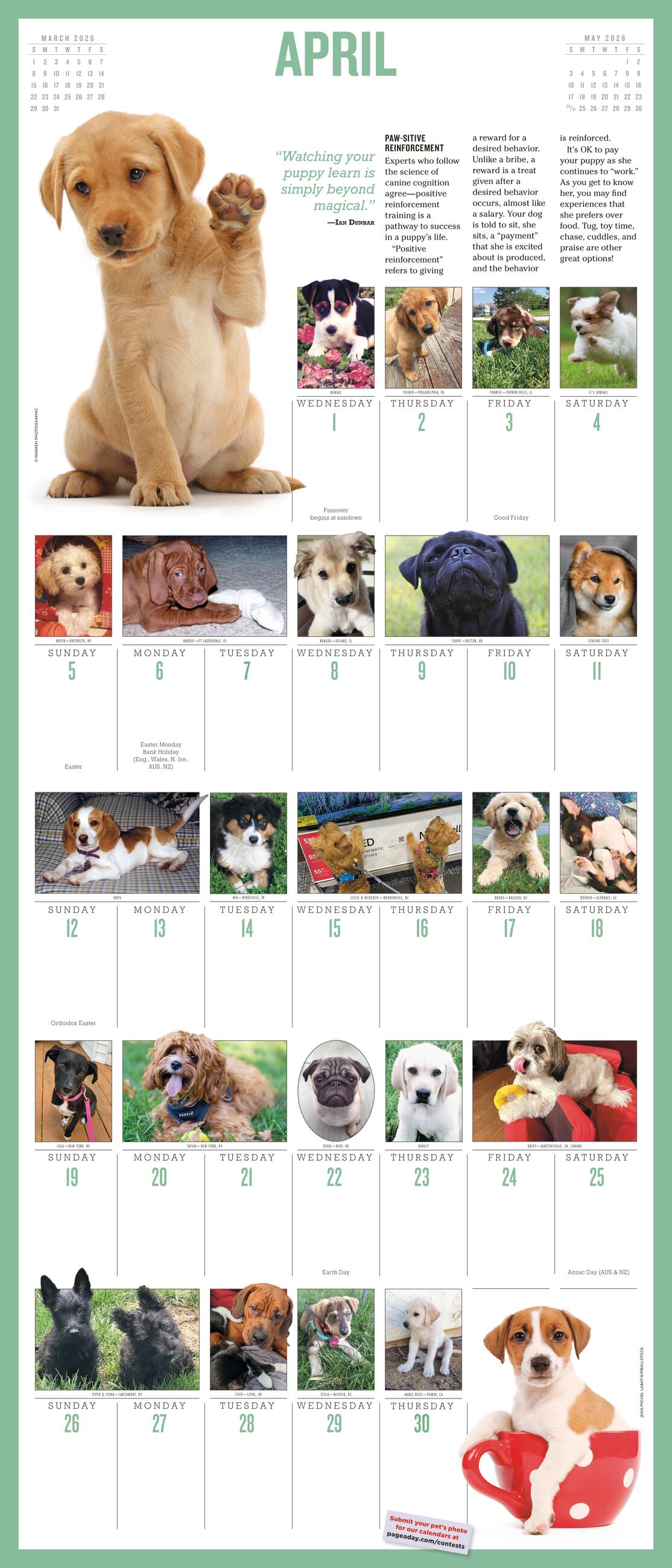 - DOG-GONE ADORABLE: The cuddly, snuggly, and sometimes silly winners of our 2026 Puppy Calendar contest star in this joyful calendar. Meet Corgis, Golden Retrievers, Beagles, and more!