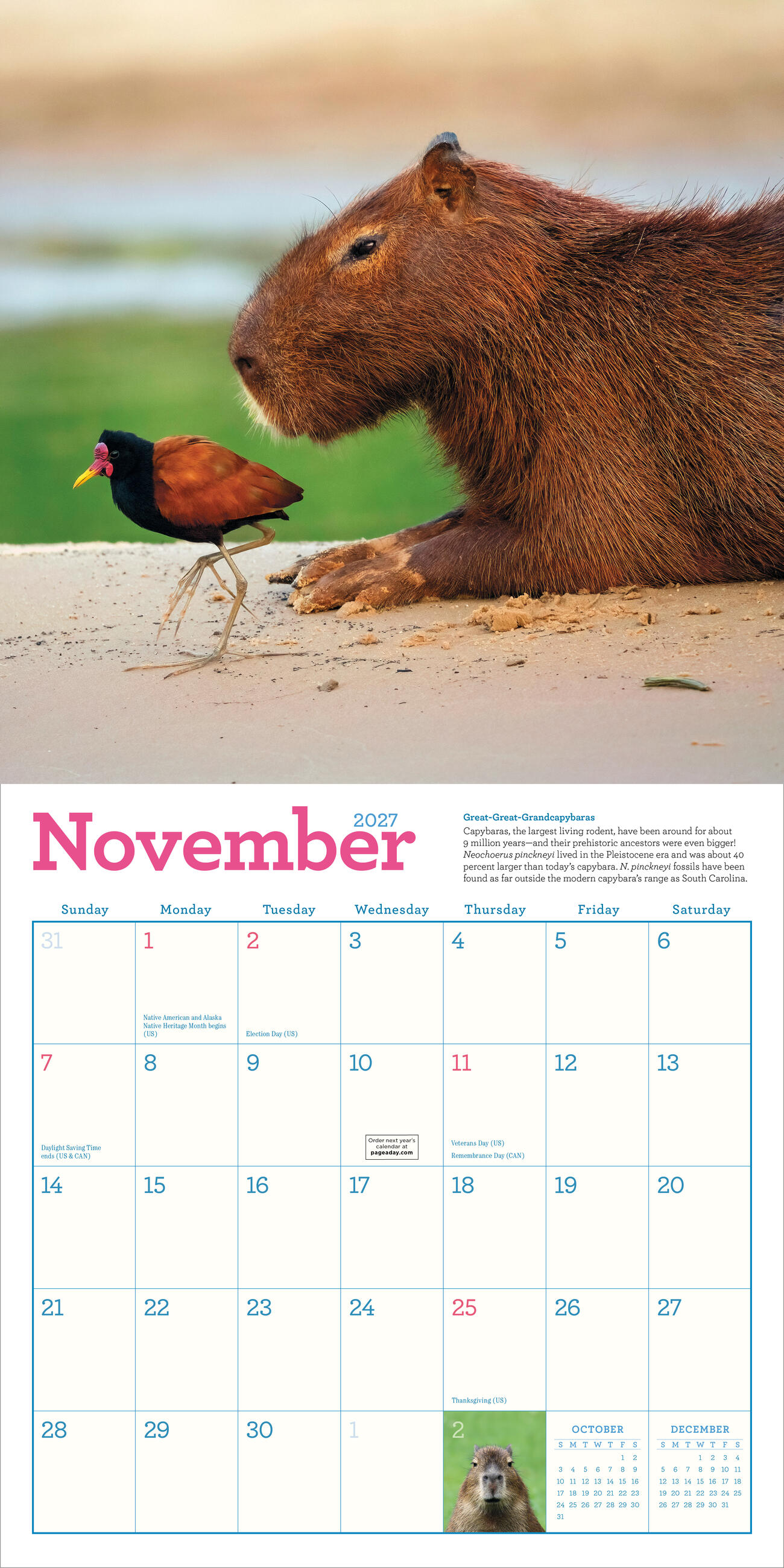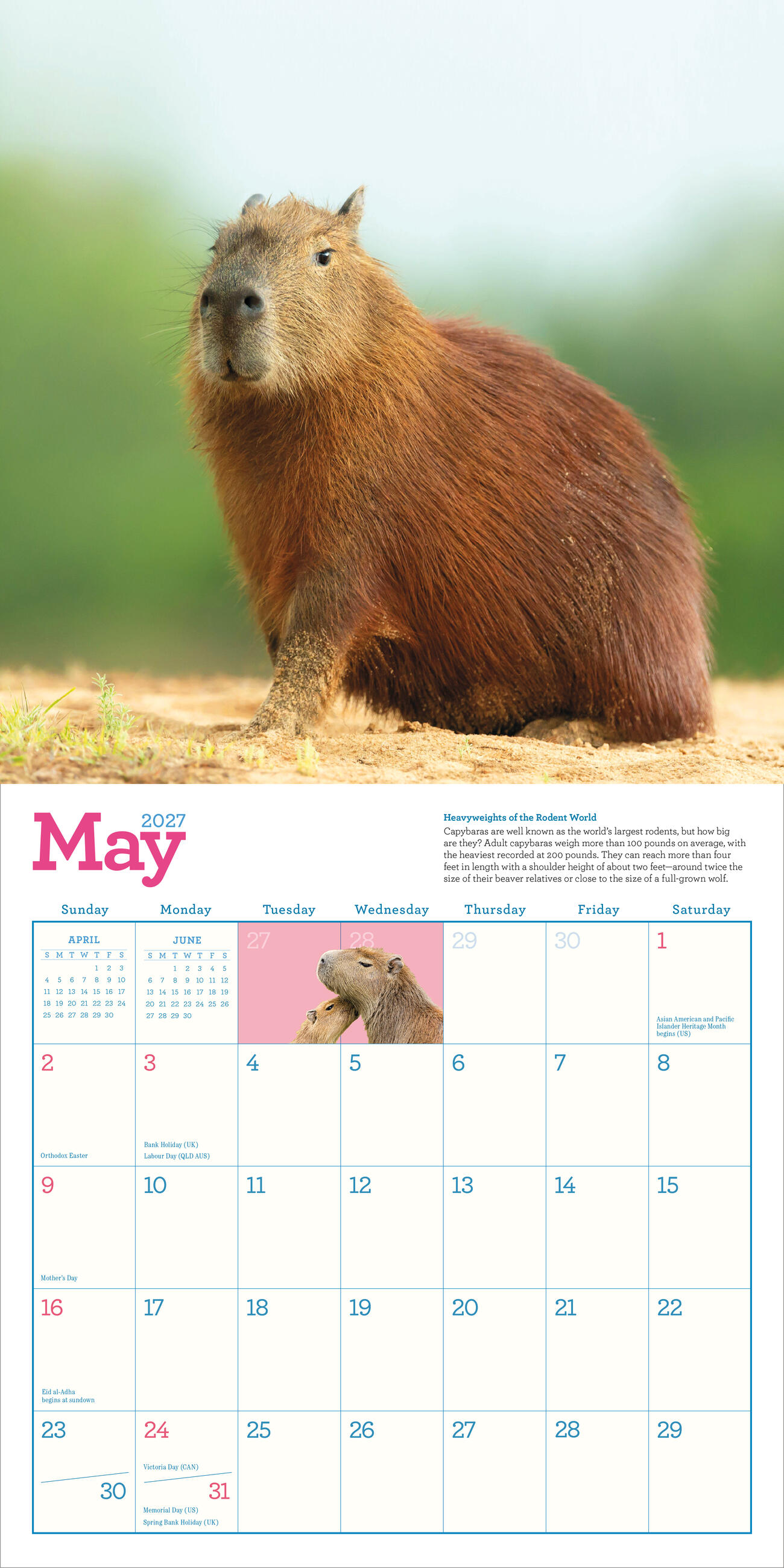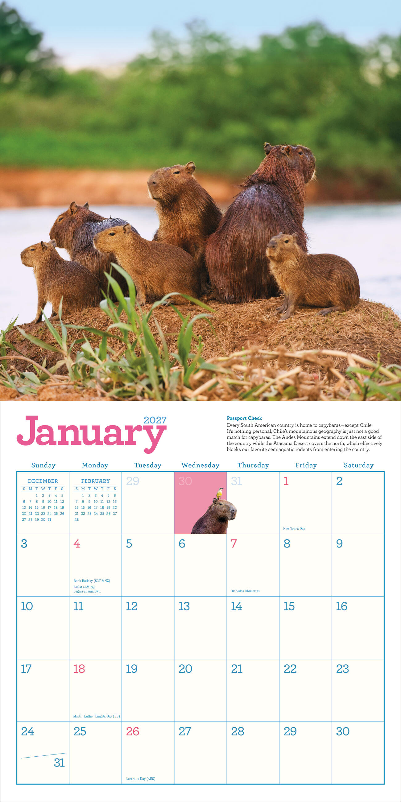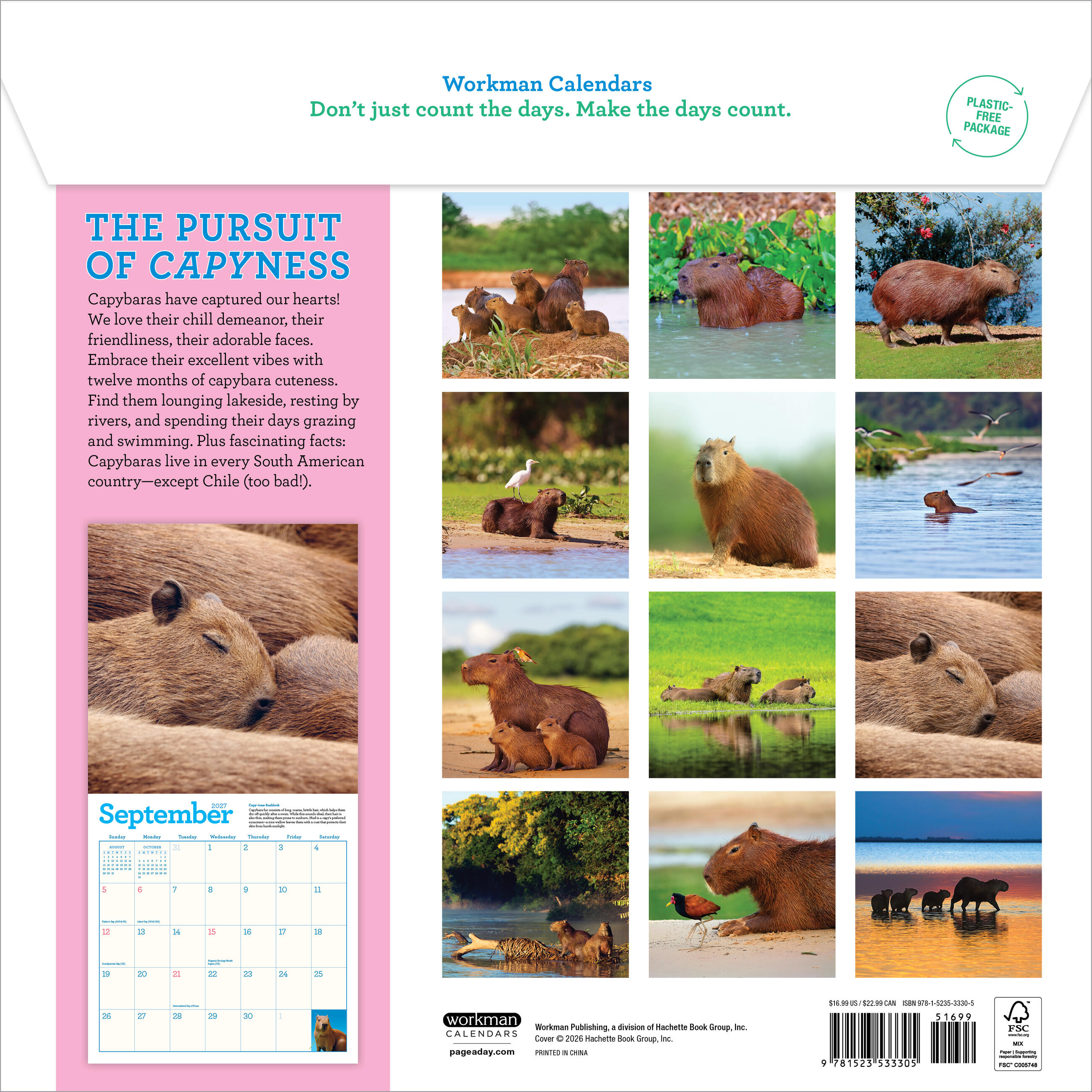 - CAPTIVATING CAPYS: Twelve months of amazing full-color capybara photos taken in their beloved natural habitats, accompanied by a fun capy fact so you can learn more about these awesome animals.