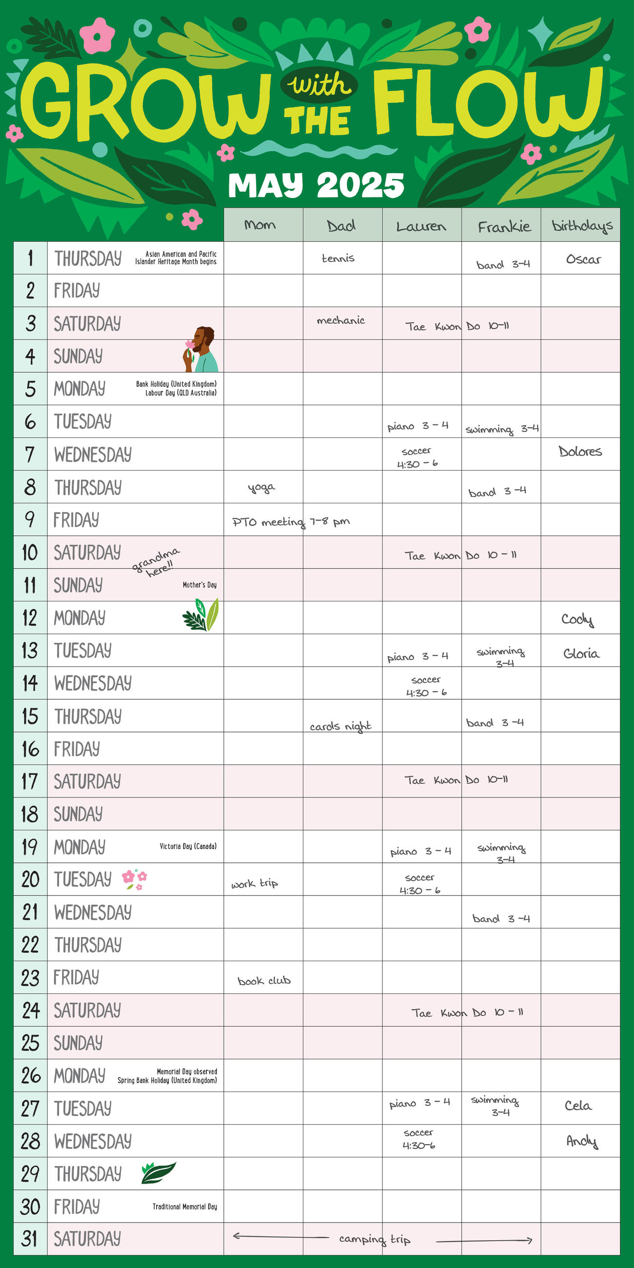 - HELLO, BUSY FAMILY!: This 17-month calendar covers the entire school year and features the signature 5-person family organizing grid, so you can easily track who goes where when.