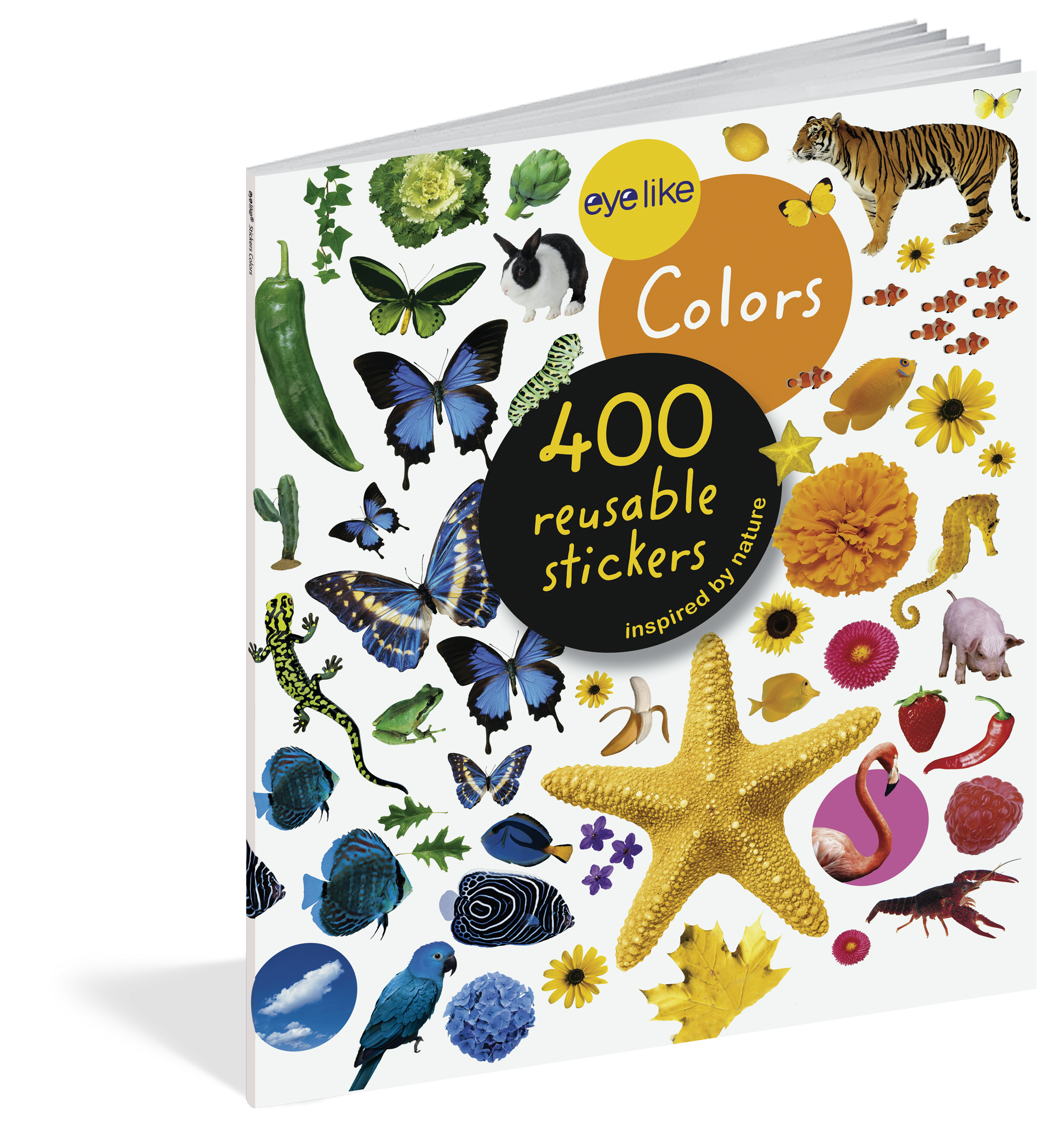 Containing stickers in every color of the rainbow, each page is full of vibrant, photorealistic images sorted by color (orange is for tigers, clownfish, pumpkins, parrots, and carrots!). Whether on windows, notebooks, lunch boxes, or scrapbooks, these peel-and-place stickers are perfect for creating your own work of art anytime, anywhere, and are designed to be stuck on, peeled off, and stuck on again without tearing or losing their “stick.” The books’ inside covers are glossy illustrated backgrounds on which kids can create lively and original sticker scenes―and then change them whenever they like.